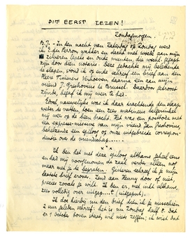 B.J. - In den nacht van Zaterdag op Zondag werd ik, E. du Perron, wakker en dacht met woede aan mijn zilveren lepels en oude munten, die wschl. gegapt zijn door dien notaris. Deze gedachte mij belettende te slapen, stond ik op ende schreef een brief aan den Heere Timmers Verhoeven, daarna een aan mijn vriend J. Greshovius te Brussel. Daardoor getroost zijnde, begaf ik mij weer te bed.