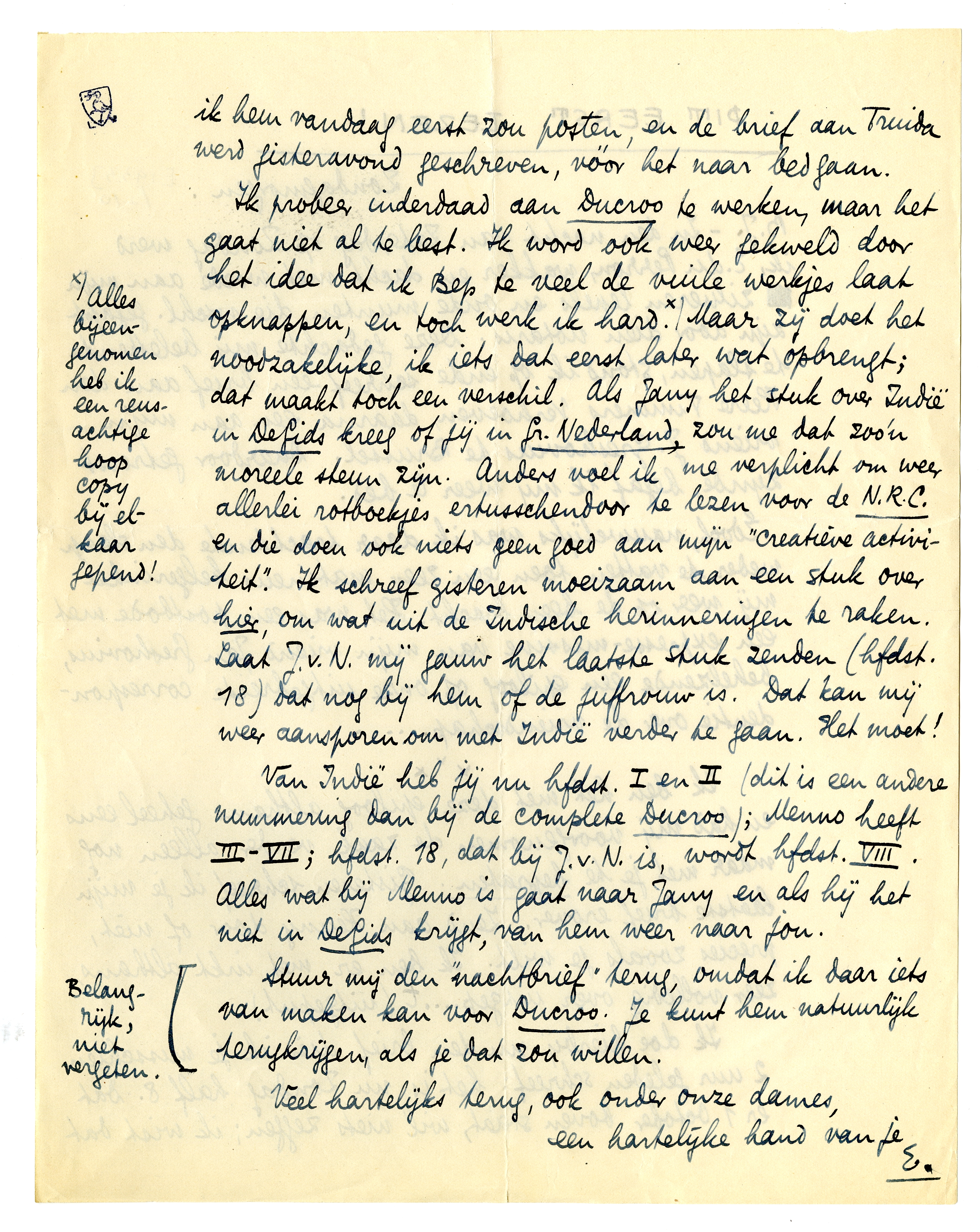 Ik probeer inderdaad aan Ducroo te werken, maar het gaat niet al te best. Ik word ook weer gekweld door het idee dat ik Bep te veel de vuile werkjes laat opknappen, en toch werk ik hard.* Maar zij doet het noodzakelijke, ik iets dat eerst later wat opbrengt; dat maakt toch een verschil. Als Jany het stuk over Indië in De Gids kreeg of jij in Gr. Nederland, zou me dat zoo'n moreele steun zijn. Anders voel ik me verplicht om weer allerlei rotboekjes ertusschendoor te lezen voor de N.R.C. en die doen ook niets geen goed aan mijn ‘creatieve activiteit’. Ik schreef gisteren moeizaam aan een stuk over hier, om wat uit de Indische herinneringen te raken. Laat J.v.N. mij gauw het laatste stuk zenden (hfdst. 18) dat nog bij hem of de juffrouw is. Dat kan mij weer aansporen om met Indië verder te gaan. Het moet!