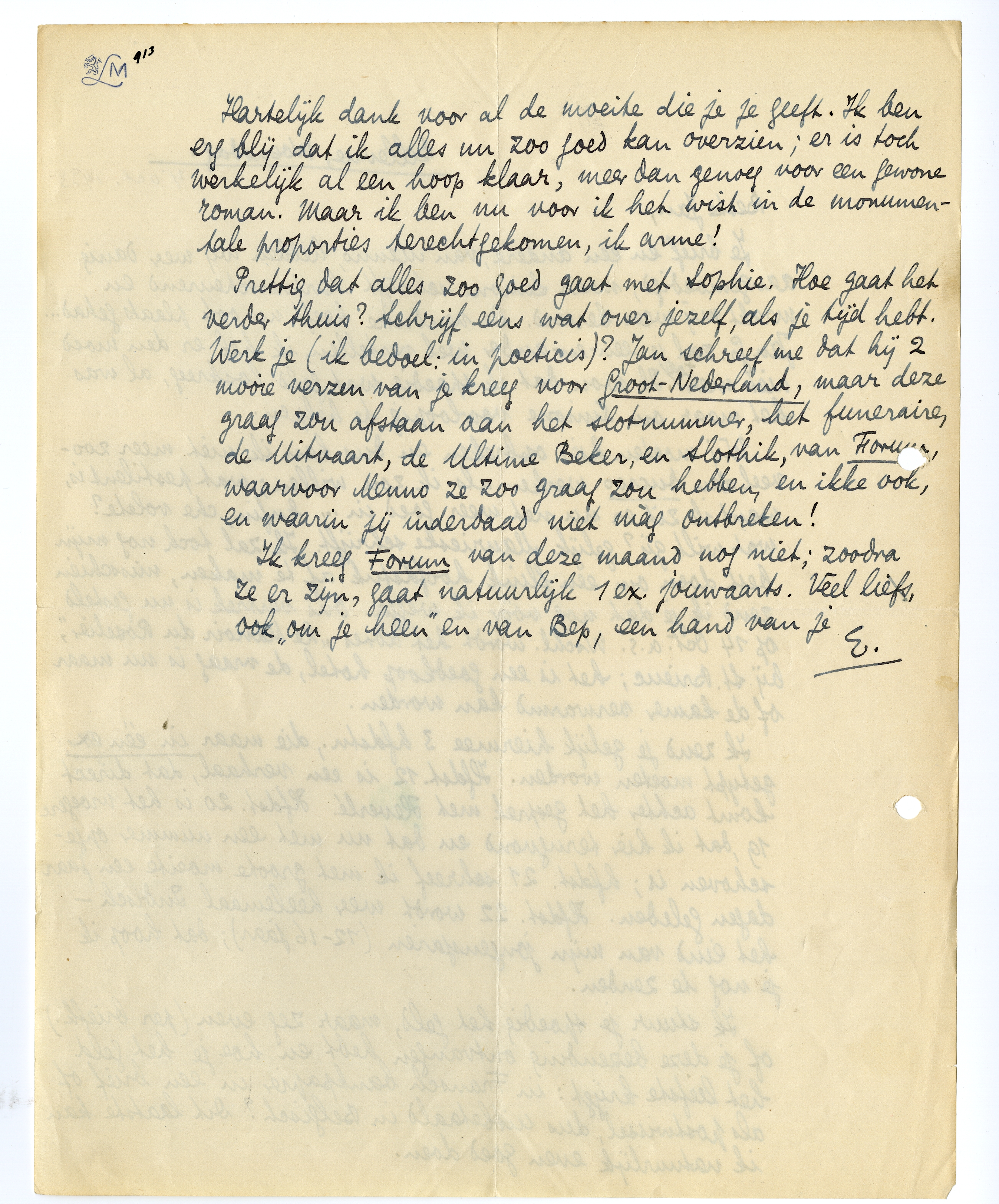 Prettig dat alles zoo goed gaat met Sophie. Hoe gaat het verder thuis? Schrijf eens wat over jezelf, als je tijd hebt. Werk je (ik bedoel: in poeticis)? Jan schreef me dat hij 2 mooie verzen van je kreeg voor Groot-Nederland,2926 maar deze graag zou afstaan aan het slotnummer, het funeraire, de Uitvaart, de Ultime Beker, en Slothik, van Forum, waarvoor Menno ze zoo graag zou hebben, en ikke ook, en waarin jij inderdaad niet màg ontbreken!