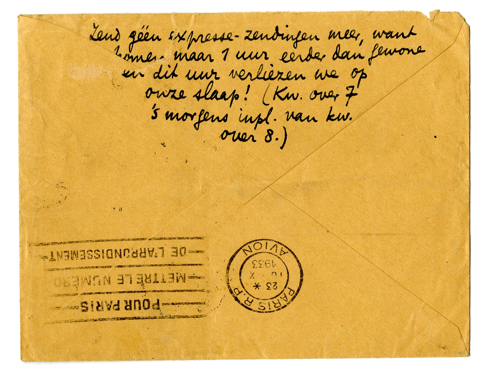 2929 Zend géén expresse-zendingen meer, want ze komen maar 1 uur eerder dan gewone en dit uur verliezen we op onze slaap! (Kw. over 7 's morgens inpl. van kw. over 8.)