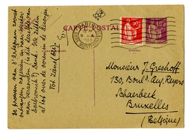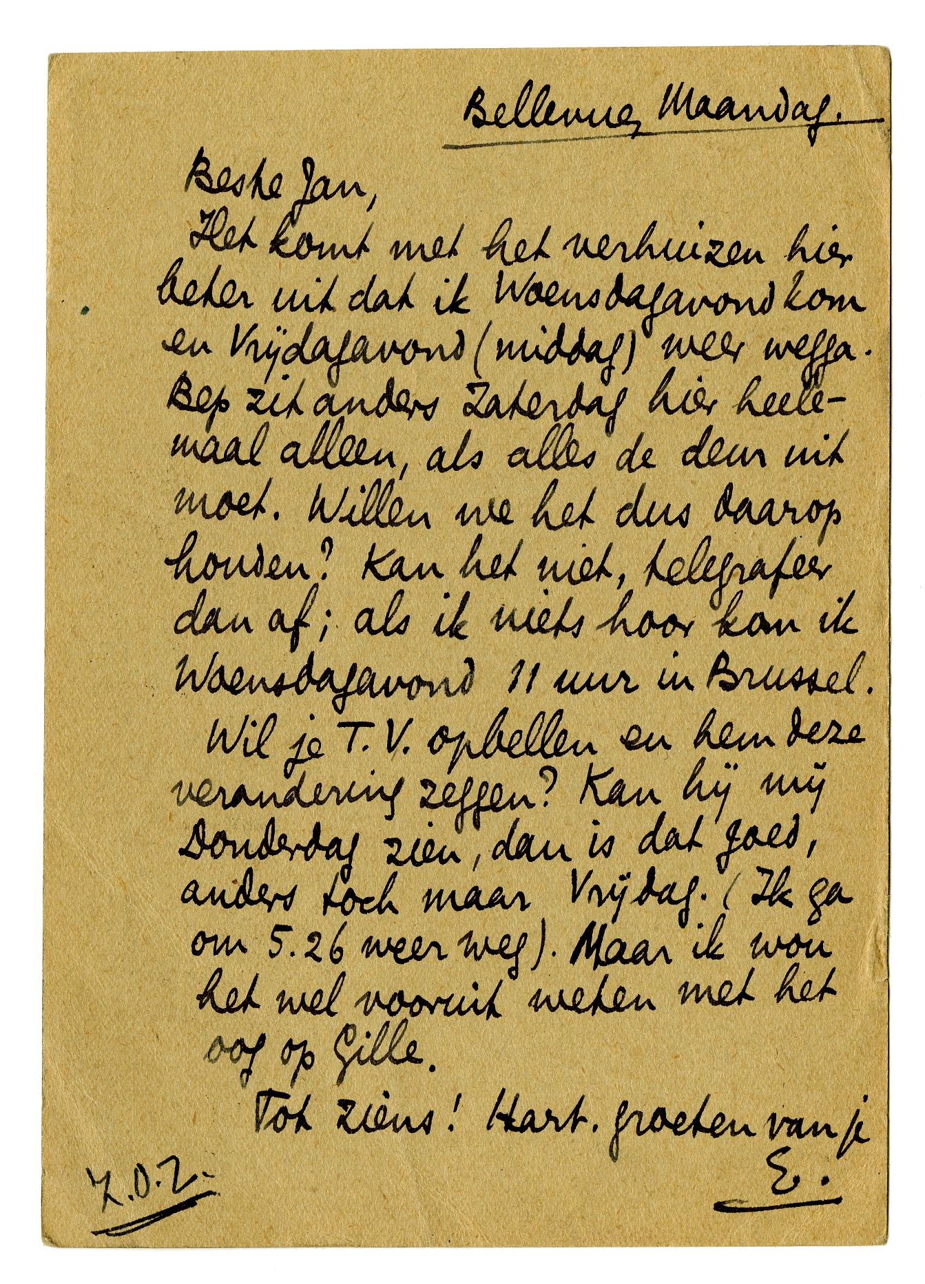 Het komt met het verhuizen hier beter uit dat ik Woensdagavond kom en Vrijdagavond(middag) weer wegga. Bep zit anders Zaterdag hier heelemaal alleen, als alles de deur uit moet. Willen we het dus daarop houden? Kan het niet, telegrafeer dan af; als ik niets hoor kom ik Woensdagavond 11 uur in Brussel.