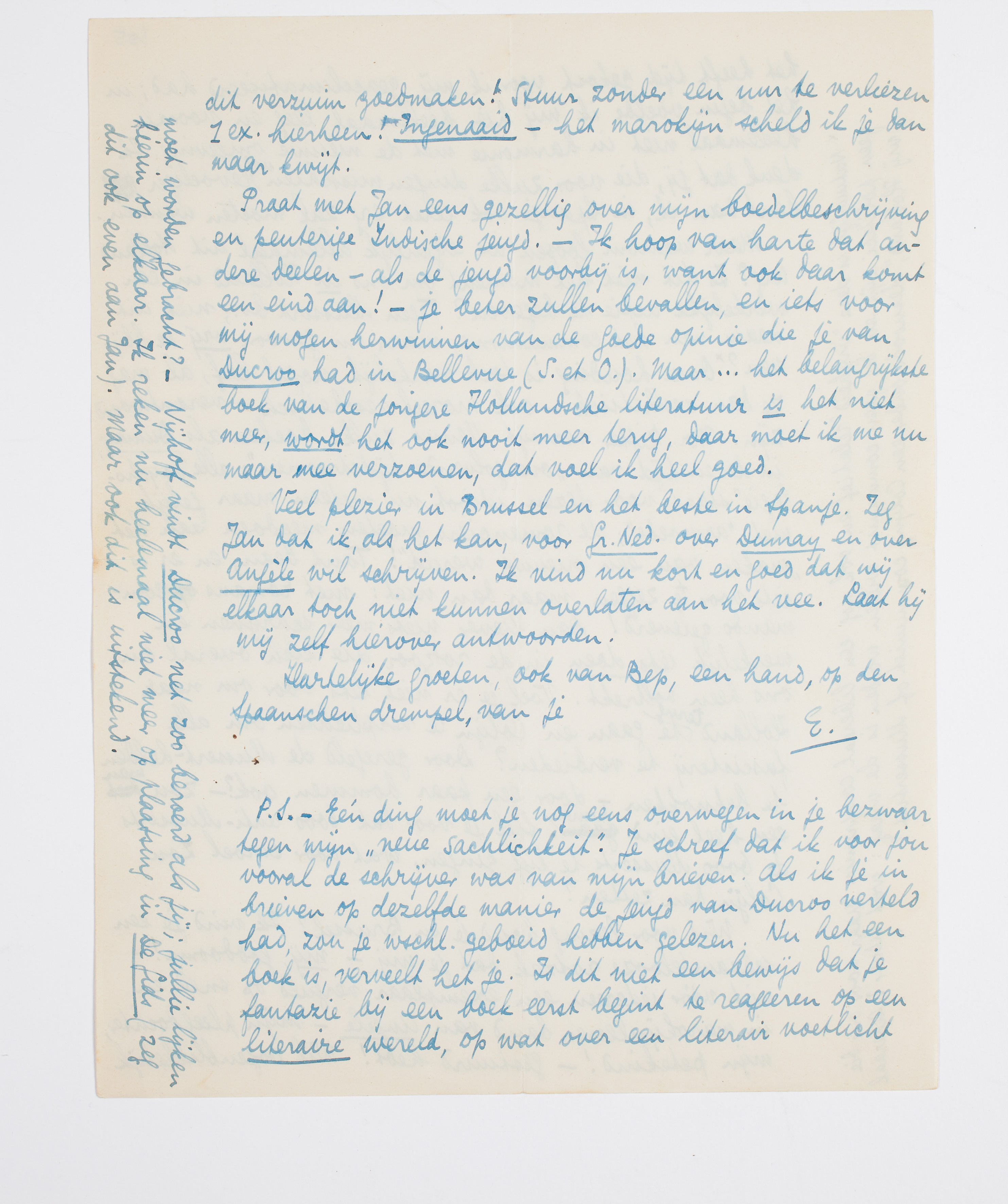 P.S. - Eén ding moet je nog eens overwegen in je bezwaar tegen mijn ‘neue Sachlichkeit’. Je schreef dat ik voor jou vooral de schrijver was van mijn brieven.2948 Als ik je in brieven op dezelfde manier de jeugd van Ducroo verteld had, zou je wschl. geboeid hebben gelezen. Nu het een boek is, verveelt het je. Is dit niet een bewijs dat je fantazie bij een boek eerst begint te reageeren op een literaire wereld, op wat over een literair voetlicht moet worden gebracht? - Nijhoff vindt Ducroo net zoo beroerd als jij; jullie lijken hierin op elkaar. Ik reken nu heelemaal niet meer op plaatsing in De Gids (zeg dit ook even aan Jan). Maar ook dit is uitstekend.