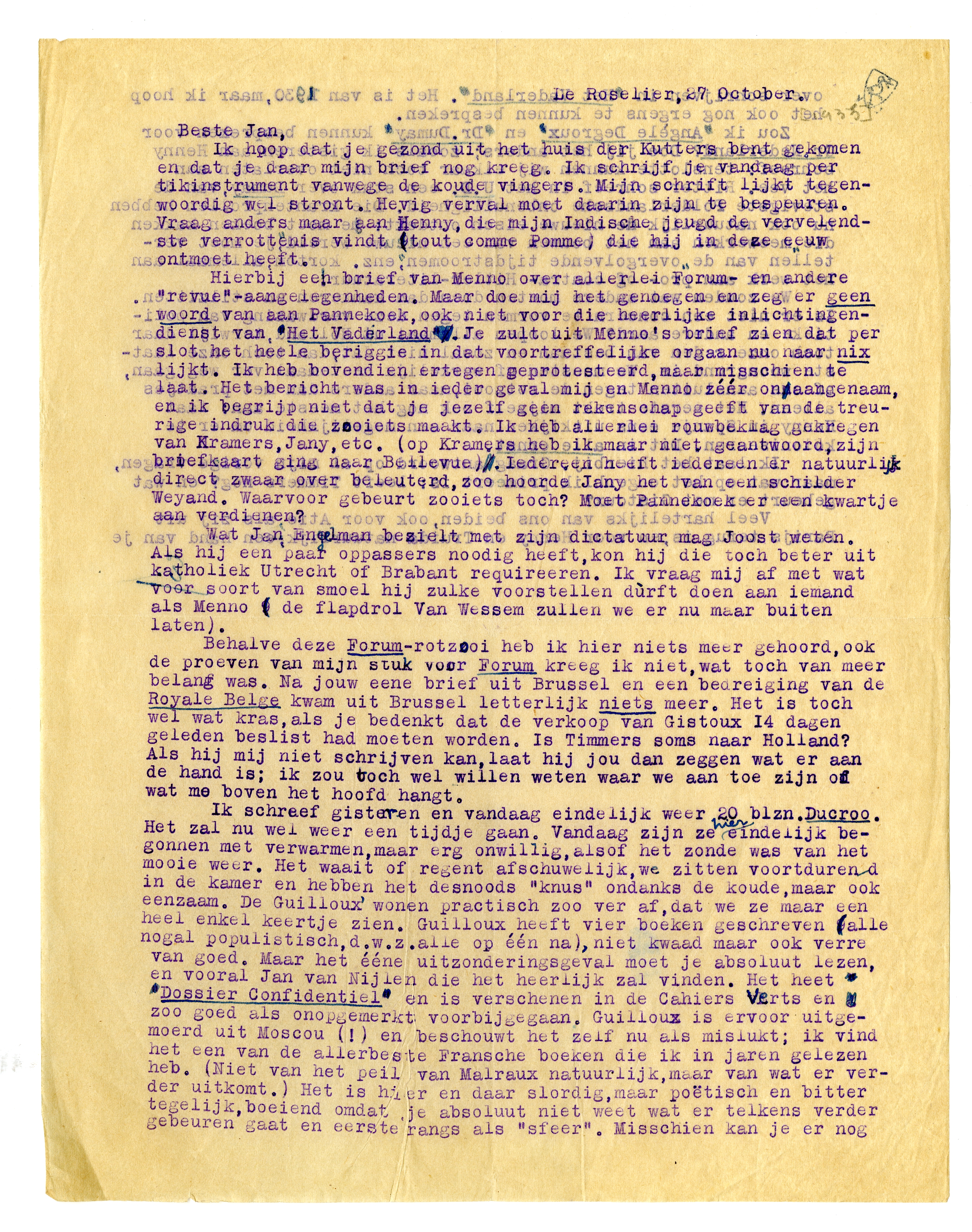 Ik hoop dat je gezond uit het huis der Kutters bent gekomen en dat je daar mijn brief nog kreeg. Ik schrijf je vandaag per tikinstrument vanwege de koude vingers. Mijn schrift lijkt tegenwoordig wel stront. Hevig verval moet daarin zijn te bespeuren. Vraag anders maar aan Henny, die mijn Indische jeugd de vervelendste verrottenis vindt (tout comme Pomme) die hij in deze eeuw ontmoet heeft.