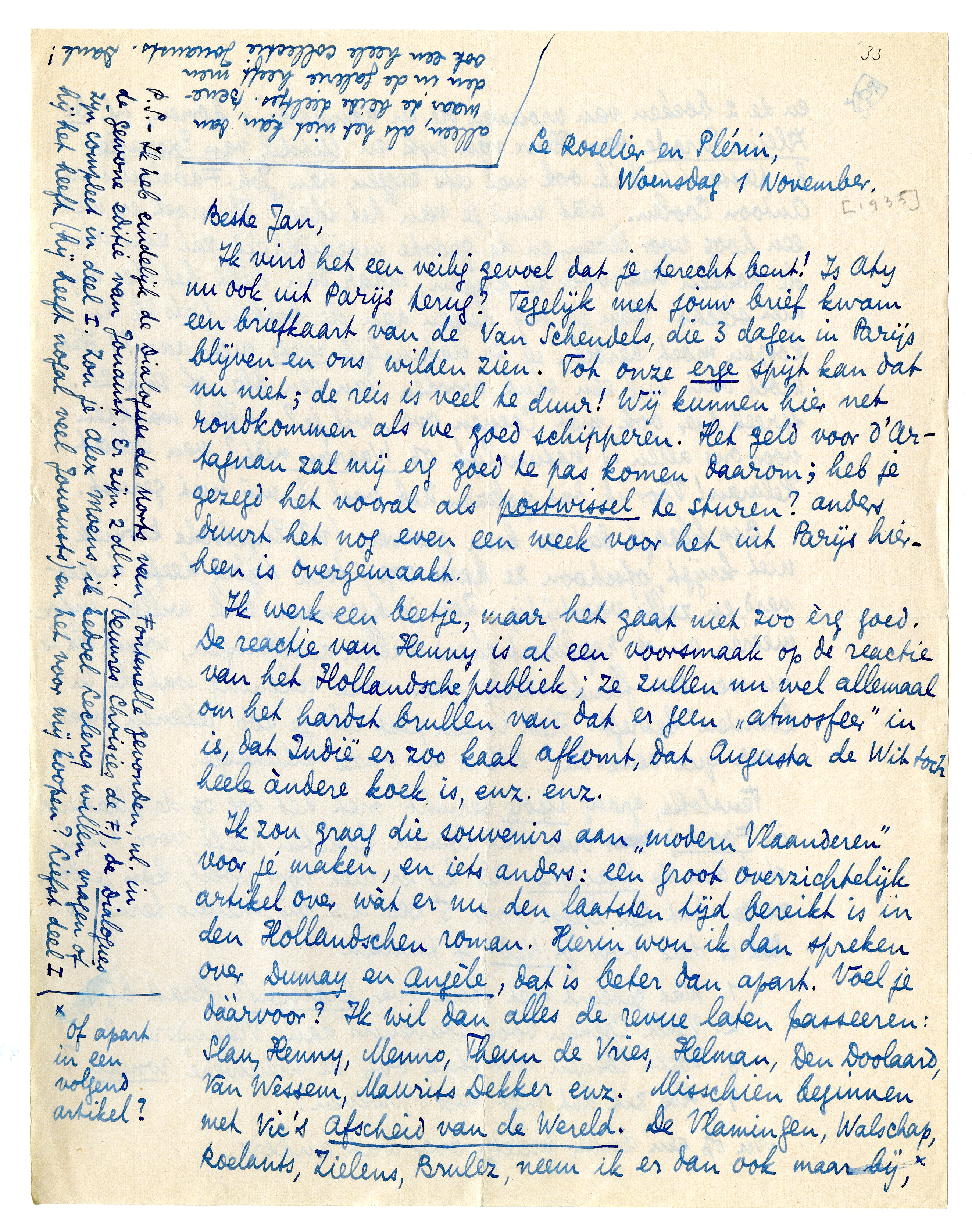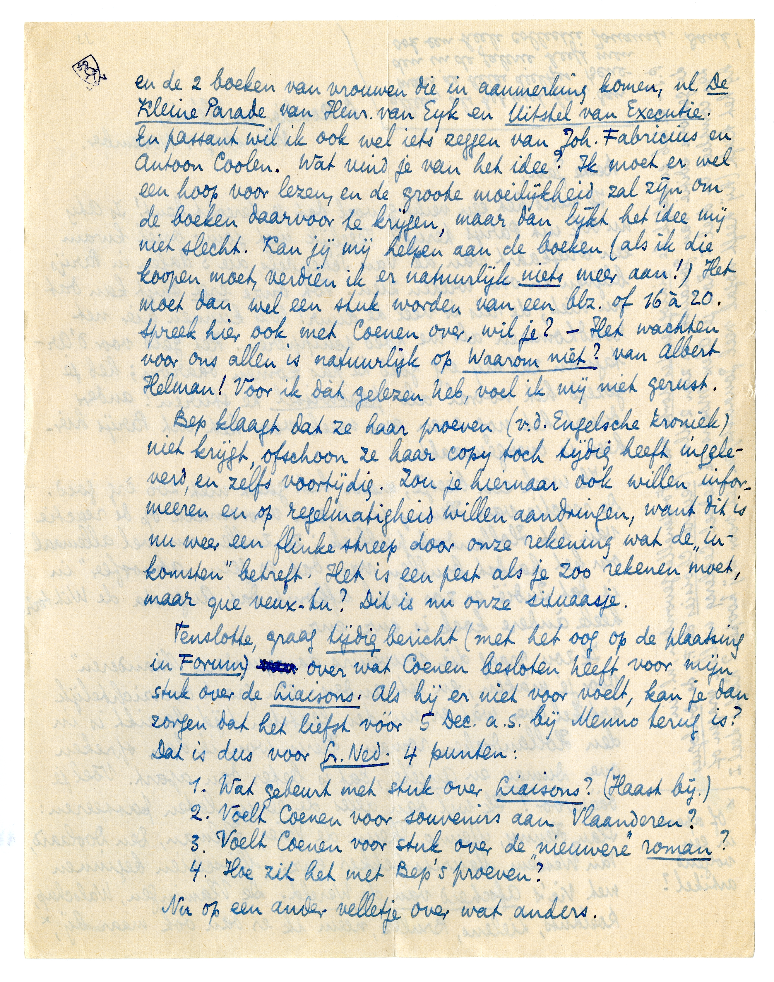 Ik zou graag die souvenirs aan ‘modern Vlaanderen’ voor je maken, en iets anders: een groot overzichtelijk artikel over wàt er nu den laatsten tijd bereikt is in den Hollandschen roman. Hierin wou ik dan spreken over Dumay en Angèle, dat is beter dan apart. Voel je dààrvoor? Ik wil dan alles de revue laten passeeren: Slau, Henny, Menno, Theun de Vries, Helman, Den Doolaard, Van Wessem, Maurits Dekker enz. Misschien beginnen met Vic's Afscheid van de Wereld. De Vlamingen, Walschap, Roelants, Zielens, Brulez, neem ik er dan ook maar bij,* en de 2 boeken van vrouwen die in aanmerking komen, nl. De Kleine Parade van Henr. van Eyk en Uitstel van Executie. En passant wil ik ook wel iets zeggen van Joh. Fabricius en Antoon Coolen. Wat vind je van het idee? Ik moet er wel een hoop voor lezen, en de groote moeilijkheid zal zijn om de boeken daarvoor te krijgen, maar dan lijkt het idee mij niet slecht. Kan jij mij helpen aan de boeken ( als ik die koopen moet, verdien ik er natuurlijk niets meer aan!) Het moet dan wel een stuk worden van een blz. of 16 à 20. Spreek hier ook met Coenen over, wil je? - Het wachten voor ons allen is natuurlijk op Waarom niet? van Albert Helman! Voor ik dàt gelezen heb, voel ik mij niet gerust.