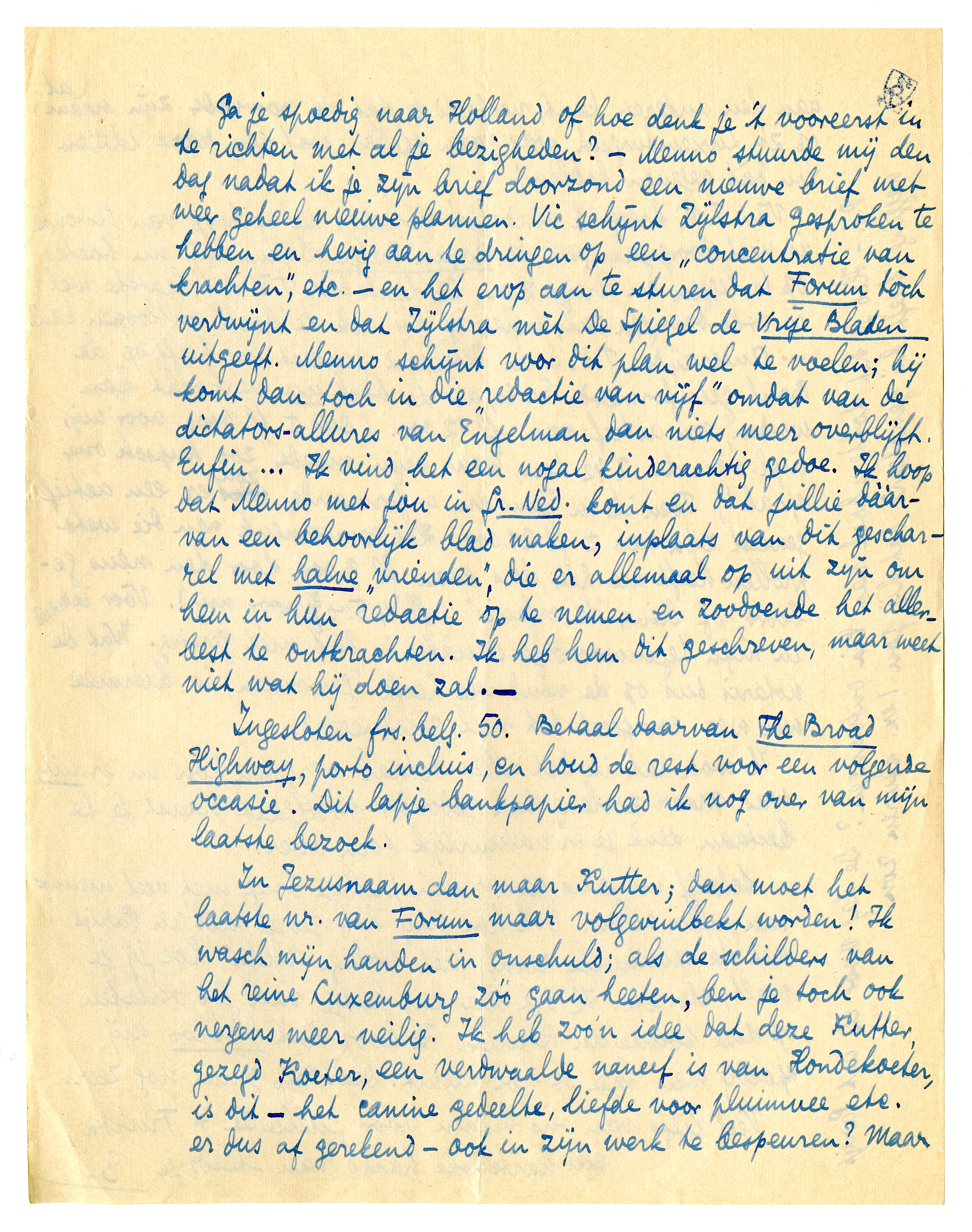 Ga je spoedig naar Holland of hoe denk je 't vooreerst in te richten met al je bezigheden? - Menno stuurde mij den dag nadat ik je zijn brief doorzond een nieuwe brief met weer geheel nieuwe plannen.2953 Vic schijnt Zijlstra geproken te hebben en hevig aan te dringen op een ‘concentratie van krachten’, etc. - en het erop aan te sturen dat Forum tòch verdwijnt en dat Zijlstra mèt De Spiegel de Vrije Bladen uitgeeft. Menno schijnt voor dit plan wel te voelen; hij komt dan toch in die ‘redactie van vijf’ omdat van de dictators-allures van Engelman dan niets meer overblijft. Enfin... Ik vind het een nogal kinderachtig gedoe. Ik hoop dat Menno met jou in Gr.Ned. komt en dat jullie dààrvan een behoorlijk blad maken, inplaats van dit gescharrel met halve ‘vrienden’, die er allemaal op uit zijn om hem in hun redactie op te nemen en zoodoende het allerbest te ontkrachten. Ik heb hem dit geschreven, maar weet niet wat hij doen zal. -