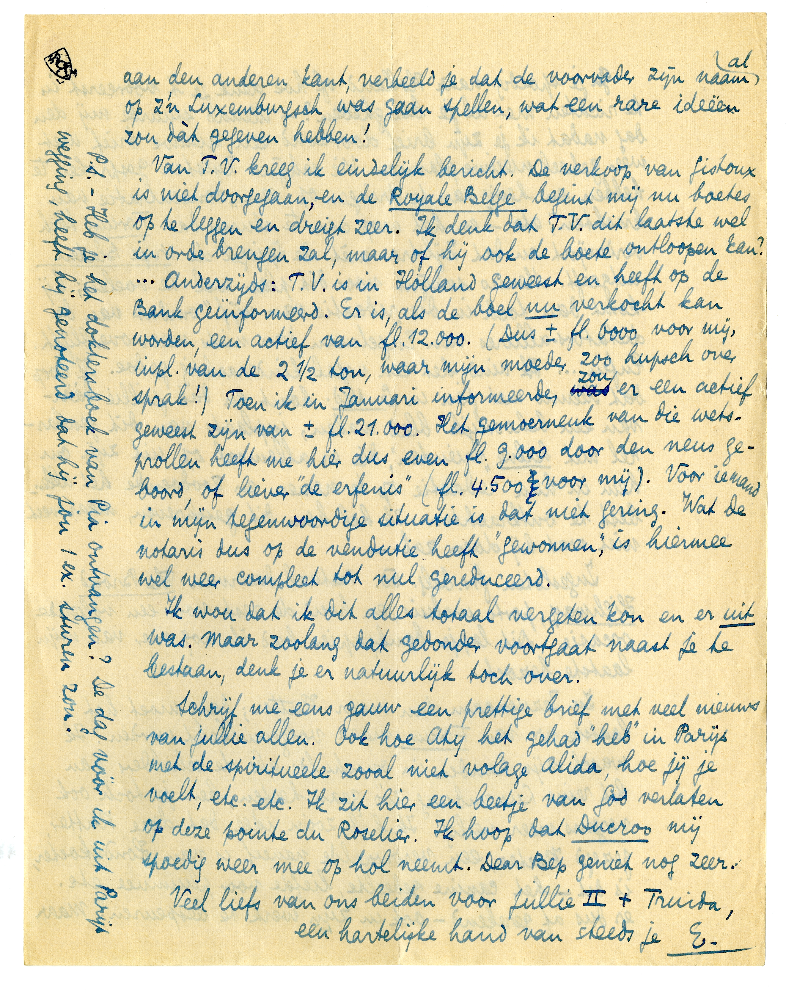 Van T.V. kreeg ik eindelijk bericht. De verkoop van Gistoux is niet doorgegaan, en de Royale Belge begint mij nu boetes op te leggen en dreigt zeer. Ik denk dat T.V. dit laatste wel in orde brengen zal, maar of hij ook de boete ontloopen kan?... Anderzijds: T.V. is in Holland geweest en heeft op de Bank geïnformeerd. Er is, als de boel nu verkocht kan worden, een actief van fl. 12.000. (Dus ± fl. 6000 voor mij, inpl. van de 2½ ton, waar mijn moeder zoo hupsch over sprak!) Toen ik in Januari informeerde, zou er een actief geweest zijn van ± fl. 21.000. Het gemoerneuk van die wetsprollen heeft me hier dus even fl. 9.000 door den neus geboord, of liever ‘de erfenis’ (fl. 4.500 voor mij). Voor iemand in mijn tegenwoordige situatie is dat niet gering. Wat de notaris dus op de vendutie heeft ‘gewonnen’, is hiermee wel weer compleet tot nul gereduceerd.