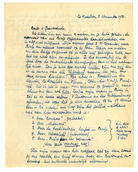 We zitten hier nu ruim 2 weken, en je hebt gezien: de voorraad van uit Parijs opgezamelde tooneelnotities, etc. is nòg niet uitgeput. Mijn vrouw gaat ± 10 November naar Parijs om nieuwe voorraad op te doen. Maar we maken ons een beetje ongerust of je alles wel gekregen hebt, omdat we niets zien verschijnen. Is dit eenvoudig een te laat door de omtrekkende bewegingen, dan is het natuurlijk niets. Zou je niet zoo aardig willen zijn om mij een nr. te sturen van elk Vaderland waarin iets van ons staat, direct hierheen? Het adres is: Hostellerie du Manoir, Le Roselier en Plérin (Côtes-du-Nord), Frankrijk. Als er iets is waar men speciaal op gesteld is, waarschuw ons dan ook hier. Zoodra mijn vrouw in Parijs is, zal ze de twee salons (d'Automne en des Indépendants)2955 afwerken; die copy heb je dus tusschen 12 en 15 November. - Er moeten nu nog zijn bij jullie - althans wat van hier verzonden werd is: