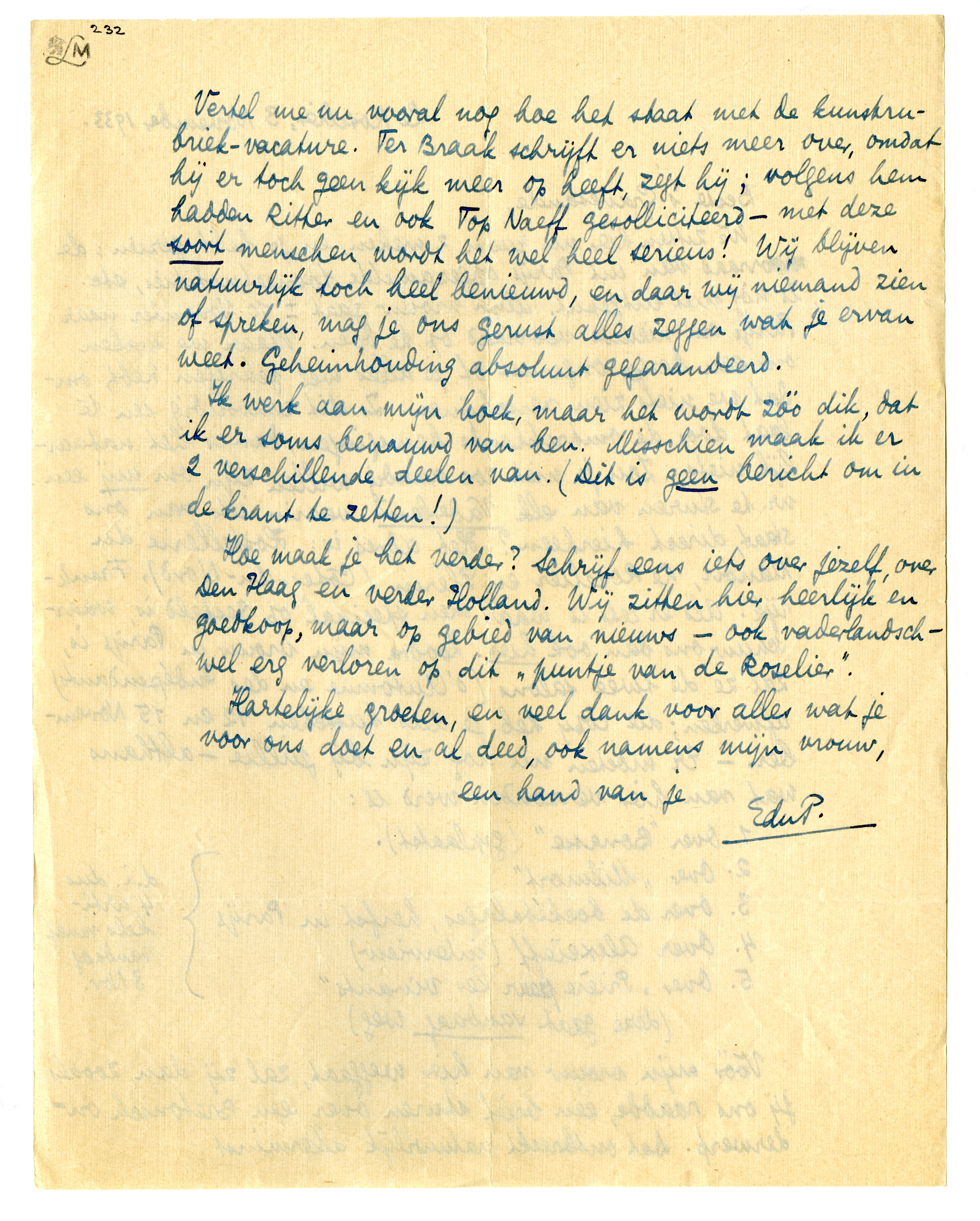 Vertel me nu vooral nog hoe het staat met de kunstrubriek-vaca-ture. Ter Braak schrijft er niets meer over, omdat hij er toch geen kijk meer op heeft, zegt hij; volgens hem hadden Ritter en ook Top Naeff gesolliciteerd - met deze soort menschen wordt het wel heel serieus! Wij blijven natuurlijk toch heel benieuwd, en daar wij niemand zien of spreken, mag je ons gerust alles zeggen wat je ervan weet. Geheimhouding absoluut gegarandeerd.