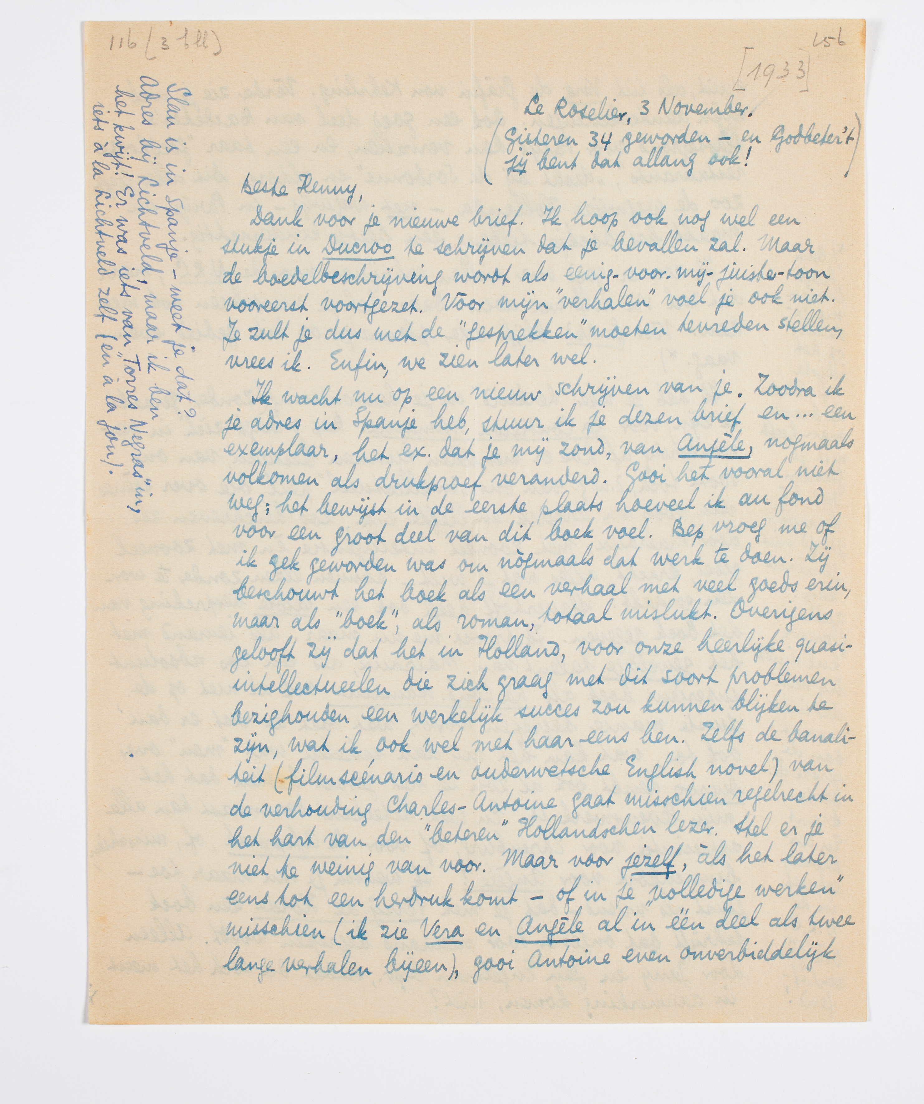 Ik wacht nu op een nieuw schrijven van je. Zoodra ik je adres in Spanje heb, stuur ik je dezen brief en... een exemplaar, het ex. dat je mij zond, van Angèle, nogmaals volkomen als drukproef veranderd.2961 Gooi het vooral niet weg; het bewijst in de eerste plaats hoe-veel ik au fond voor een groot deel van dit boek voel. Bep vroeg me of ik gek geworden was om nògmaals dat werk te doen. Zij beschouwt het boek als een verhaal met veel goeds erin, maar als ‘boek’, als roman, totaal mislukt. Overigens gelooft zij dat het in Holland, voor onze heerlijke quasi-intellectueelen die zich graag met dit soort problemen bezighouden een werkelijk succes zou kunnen blijken te zijn, wat ik ook wel met haar eens ben. Zelfs de banaliteit (filmscénario en ouderwetsche English novel) van de verhouding Charles-Antoine gaat misschien regelrecht in het hart van den ‘beteren’ Hollandschen lezer. Stel er je niet te weinig van voor. Maar voor jezelf, àls het later eens tot een herdruk komt - of in je ‘volledige werken’ misschien (ik zie Vera en Angèle al in één deel als twee lange verhalen bijeen), gooi Antoine even onverbiddelijk eruit, als uit Vera de Gräfin von Kehrling. Verder zie je wel mijn aanteekeningen. Ook een goed deel van Baedeker's plattegrond voor Parijs kan vervallen, en een paar ‘goedkoope restaurants’, ‘dicht bij de Sorbonne’ en elders. Dit alles geeft zoo de wegwijze Hollander - net wegwijs - in Parijs, en maakt het boekje telkens een beetje kinderachtig.