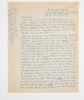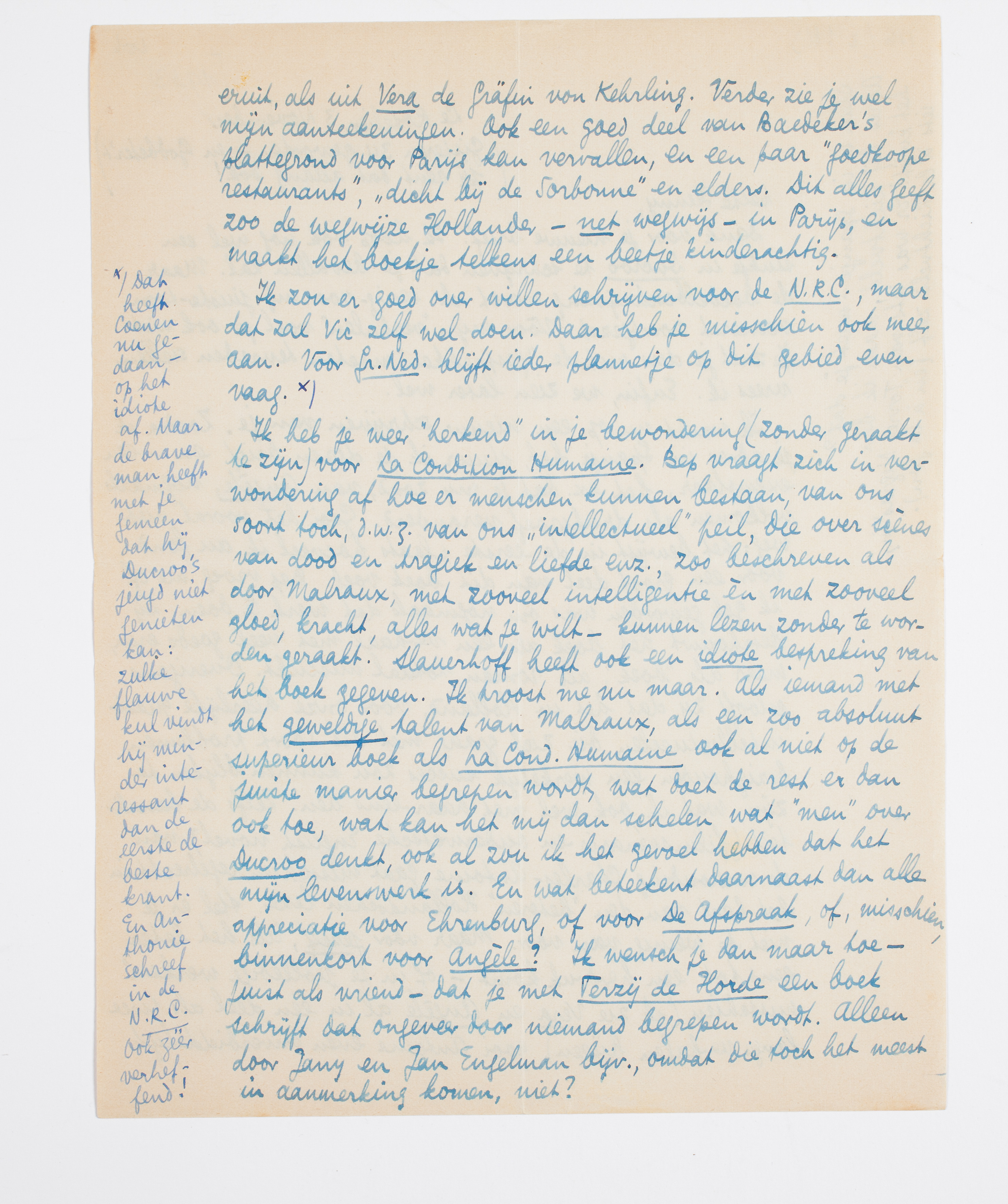 Holland was kotzenswürdig. Angstig beroerd. Ik vond er niets, maar was après tout weer blij er maar niets te hebben gevonden. Ducroo komt hoogstwschl. bij Querido, die meer biedt dan Van Kampen, althans, dat denk ik, want van den laatsten verwacht ik nader bericht. Het MS. van 500 blzn. is nu bij hem. Ik kan er voorloopig helaas niets aan doen; ik heb de handen vol met het boek van Malraux, dat erg moeilijk is en mij veel minder ‘ligt’ dan ik aanvankelijk dacht. (‘Was het Larbaud maar!’ denk ik soms.)