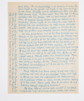 O ja, wat nu dat ex. van Angèle betreft: ik wil géén geb. ex.; niet zoozeer om het kaftje, dat ik er wel af kan halen als ik het zelf laat binden, alswel om die glad afgekapte randen. Ik wil ook geen opdracht met potlood; alsjeblieft nooit een opdracht met potlood! Als ik je boek verkoopen wil, scheur ik er de opdracht uit; als ik het houd, wil ik je woorden herlezen in inkt! - Als je me dus niet door Querido een ingenaaid ex. kan laten zenden, zal ik er zelf bij gelegenheid wel eens om schrijven aan die lieve mevrouw Van Nahuys.