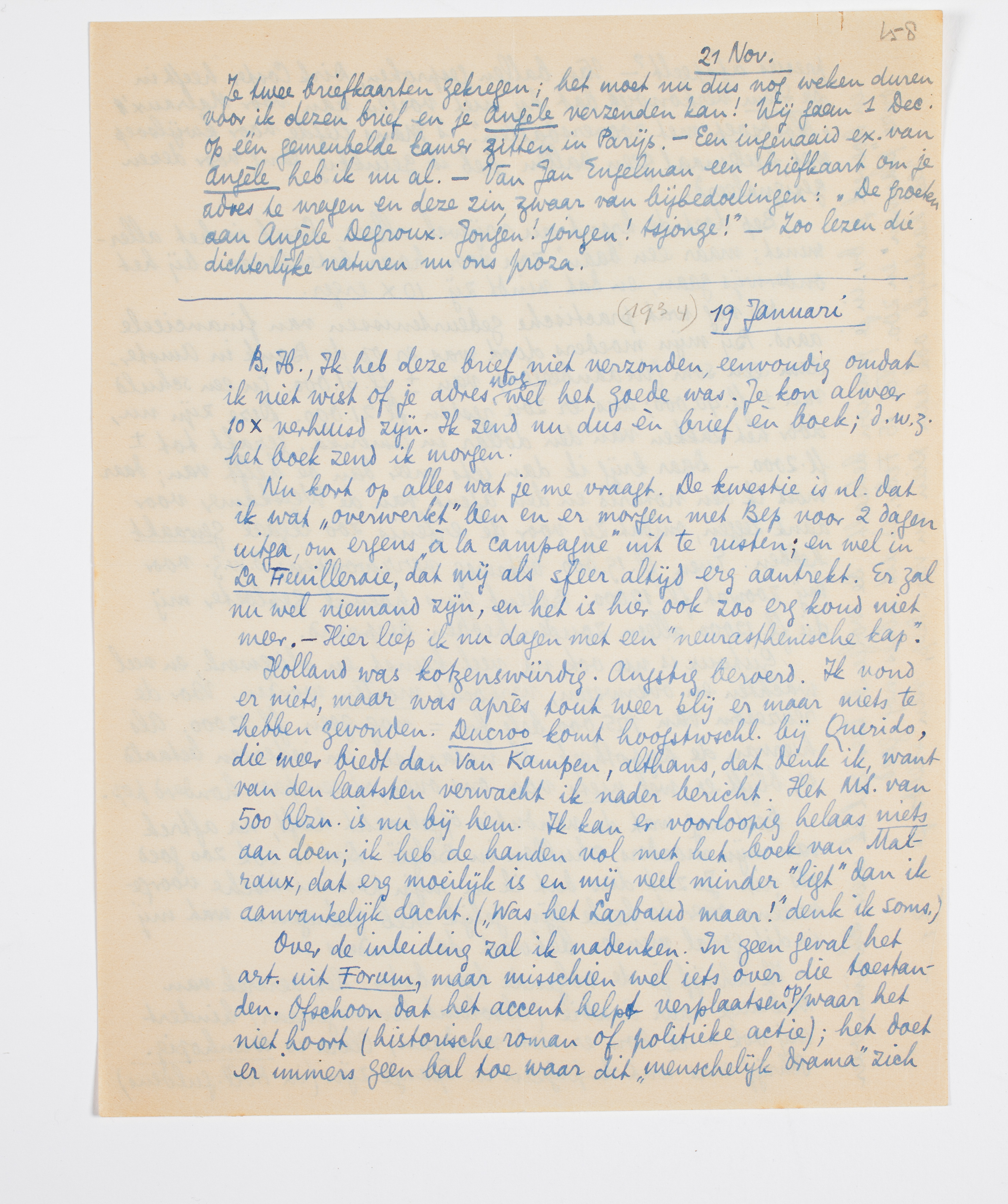 Ik heb je weer ‘herkend’ in je bewondering (zonder geraakt te zijn) voor La Condition Humaine. Bep vraagt zich in verwondering af hoe er menschen kunnen bestaan, van ons soort toch, d.w.z. van ons ‘intellectueel’ peil, die over scènes van dood en tragiek en liefde enz., zoo beschreven als door Malraux, met zooveel intelligentie èn met zooveel gloed, kracht, alles wat je wilt - kunnen lezen zonder te worden geraakt. Slauerhoff heeft ook een idiote bespreking van het boek gegeven. Ik troost me nu maar. Als iemand met het geweldige talent van Malraux, als een zoo absoluut superieur boek als La Cond. Humaine ook al niet op de juiste manier begrepen wordt, wat doet de rest er dan ook toe, wat kan het mij dan schelen wat ‘men’ over Ducroo denkt, ook al zou ik het gevoel hebben dat het mijn levenswerk is. En wat beteekent daarnaast dan alle appreciatie voor Ehrenburg, of voor De Afspraak, of, misschien binnenkort Angèle? Ik wensch je dan maar toe - juist als vriend - dat je met Terzij de Horde een boek schrijft dat ongeveer door niemand begrepen wordt. Alleen door Jany en Jan Engelman bijv., omdat die toch het meest in aanmerking komen, niet?