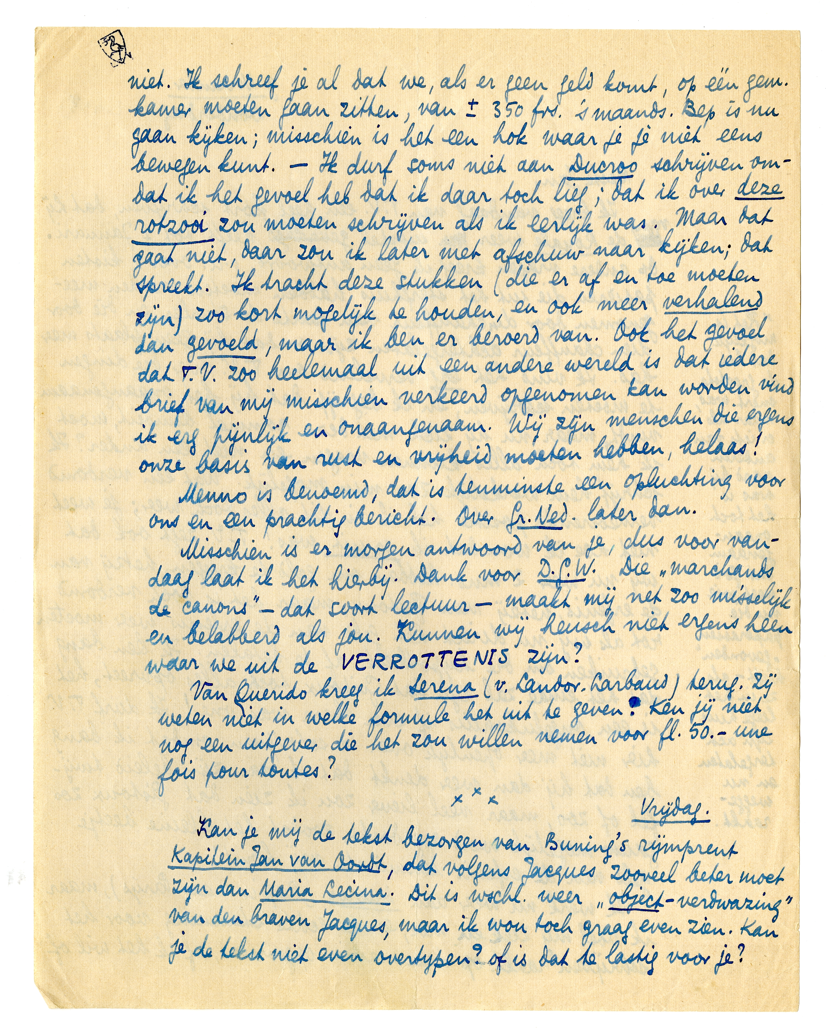 Ik werk nu weer aan Ducroo (Bep is naar Parijs), maar ik voel mij ziek en moe, en de echte stemming voor het schrijven raakt op deze manier opgevreten, of ik het wil of niet. Ik schreef je al dat we, als er geen geld komt, op één gem. kamer moeten gaan zitten, van ± 350 frs. 's maands. Bep is nu gaan kijken; misschien is het een hok waar je je niet eens bewegen kunt. - Ik durf soms niet aan Ducroo schrijven omdat ik het gevoel heb dat ik daar toch lieg; dat ik over deze rotzooi zou moeten schrijven als ik eerlijk was. Maar dat gaat niet, daar zou ik later met afschuw naar kijken; dat spreekt. Ik tracht deze stukken (die er af en toe moeten zijn) zoo kort mogelijk te houden, en ook meer verhalend dan gevoeld, maar ik ben er beroerd van. Ook het gevoel dat T.V. zoo heelemaal uit een andere wereld is dat iedere brief van mij misschien verkeerd opgenomen kan worden vind ik erg pijnlijk en onaangenaam. Wij zijn menschen die ergens onze basis van rust en vrijheid moeten hebben, helaas!