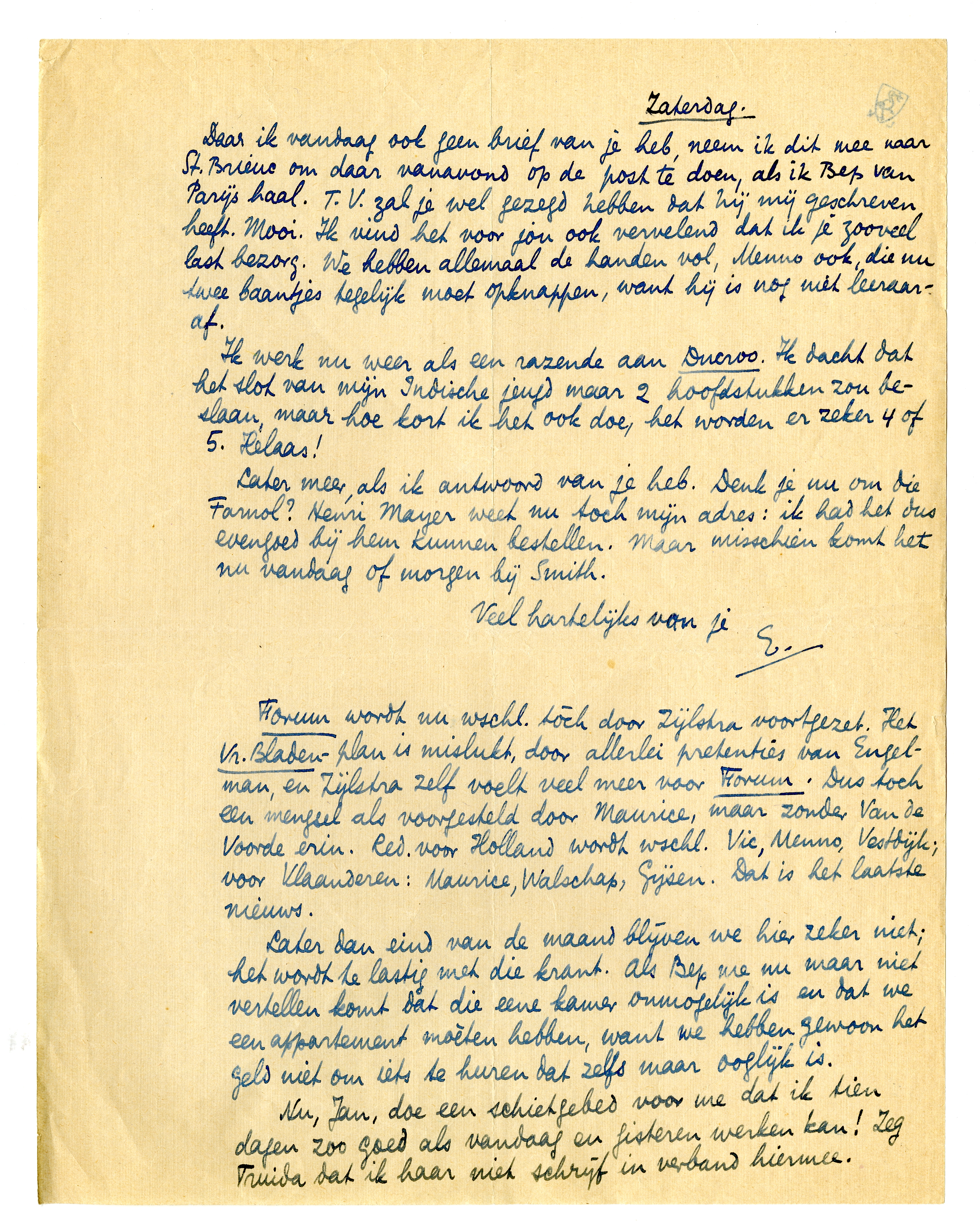 Daar ik vandaag ook geen brief van je heb, neem ik dit mee naar St. Brieuc om daar vanavond op de post te doen, als ik Bep van Parijs haal. T.V. zal je wel gezegd hebben dat hij mij geschreven heeft. Mooi. Ik vind het voor jou ook vervelend dat ik je zooveel last bezorg. We hebben allemaal de handen vol, Menno ook, die nu twee baantjes tegelijk moet opknappen, want hij is nog niet leeraar-af.
