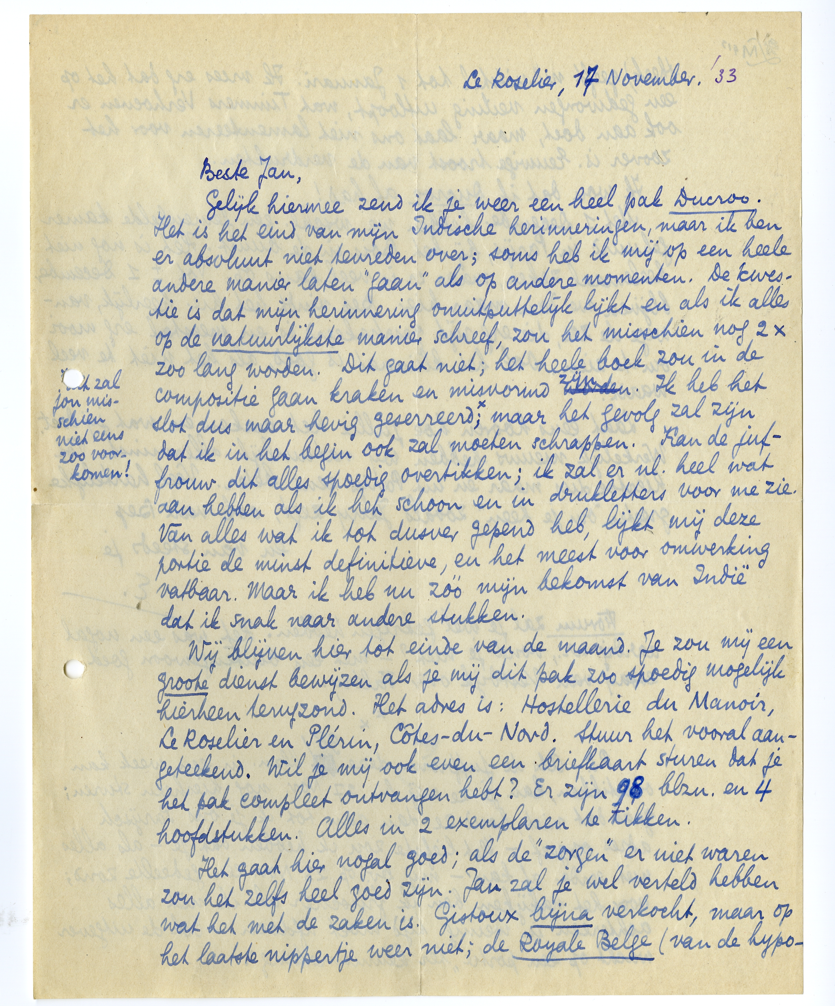 Gelijk hiermee zend ik je weer een heel pak Ducroo. Het is het eind van mijn Indische herinneringen, maar ik ben er absoluut niet tevreden over; soms heb ik mij op een heele andere manier laten ‘gaan’ als op andere momenten. De kwestie is dat mijn herinnering onuitputtelijk lijkt en als ik alles op de natuurlijkste manier schreef, zou het misschien nog 2 × zoo lang worden. Dit gaat niet; het heele boek zou in de compositie gaan kraken en misvormd zijn. Ik heb het slot dus maar hevig geserreerd;* maar het gevolg zal zijn dat ik in het begin ook zal moeten schrappen. Kan de juffrouw dit alles spoedig overtikken; ik zal er nl. heel wat aan hebben als ik het schoon en in drukletters voor me zie. Van alles wat ik tot dusver gepend heb, lijkt mij deze portie de minst definitieve, en het meest voor omwerking vatbaar. Maar ik heb nu zóó mijn bekomst van Indië dat ik snak naar andere stukken.