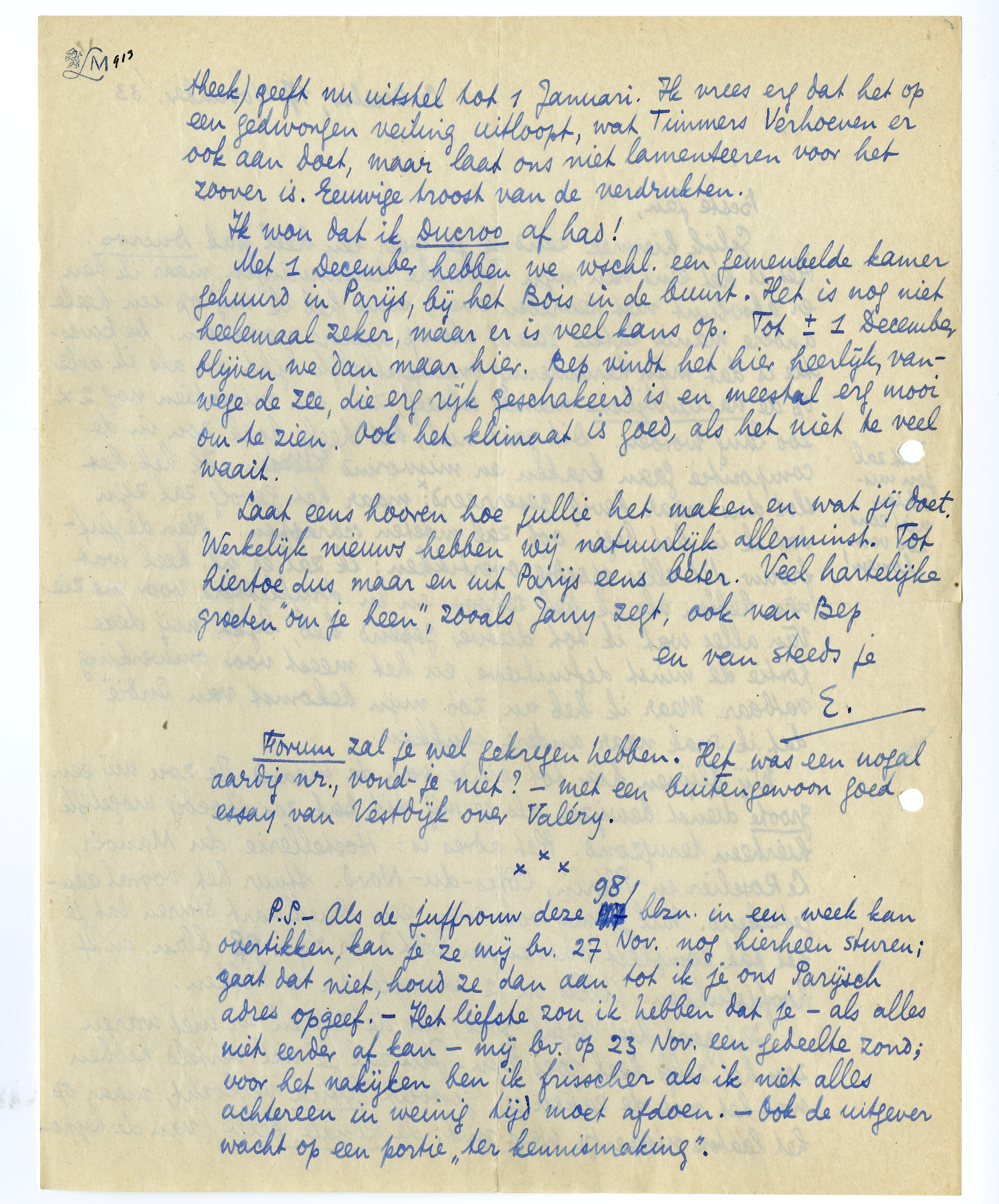 P.S. - Als dejuffrouw deze 98 blzn. in een week kan overtikken, kan je ze mij bv. 27 Nov. nog hierheen sturen; gaat dat niet, houd ze dan aan tot ik je ons Parijsch adres opgeef. - Het liefste zou ik hebben dat je - als alles niet eerder af kan - mij bv. op 23 Nov. een gedeelte zond; voor het nakijken ben ik frisscher als ik niet alles achtereen in weinig tijd moet afdoen. - Ook de uitgever wacht op een portie ‘ter kennismaking’.