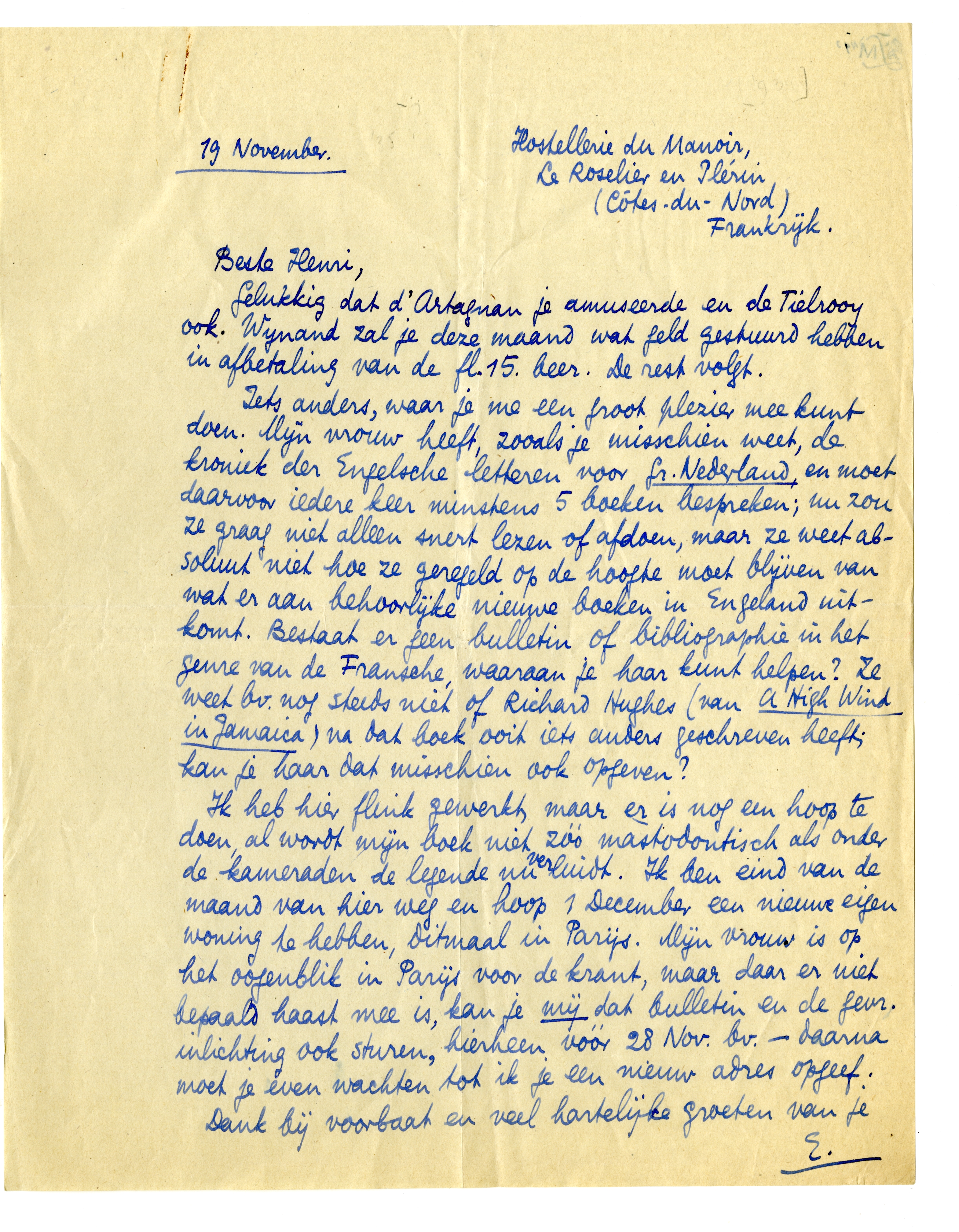 Iets anders, waar je me een groot plezier mee kunt doen. Mijn vrouw heeft, zooals je misschien weet, de kroniek der Engelsche letteren voor Gr. Nederland, en moet daarvoor iedere keer minstens 5 boeken bespreken; nu zou ze graag niet alleen snert lezen of afdoen, maar ze weet absoluut niet hoe ze geregeld op de hoogte moet blijven van wat er aan behoorlijke nieuwe boeken in Engeland uitkomt. Bestaat er geen bulletin of bibliographie in het genre van de Fransche, waaraan je haar kunt helpen? Ze weet bv. nog steeds niet of Richard Hughes (van A High Wind in Jamaica) na dat boek ooit iets anders geschreven heeft; kan je haar dat misschien ook opgeven?