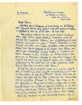 Ik heb hier flink gewerkt, maar er is nog een hoop te doen, al wordt mijn boek niet zóó mastodontisch als onder de kameraden de legende nu verluidt. Ik ben eind van de maand hier weg en hoop 1 December een nieuwe eigen woning te hebben, Ditmaal in Parijs. Mijn vrouw is op het oogenblik in Parijs voor de krant, maar daar er niet bepaald haast mee is, kan je mij dat bulletin en de gevr. inlichting ook sturen, hierheen vóór 28 Nov. bv. - daarna moet je even wachten tot ik je een nieuw adres opgeef.