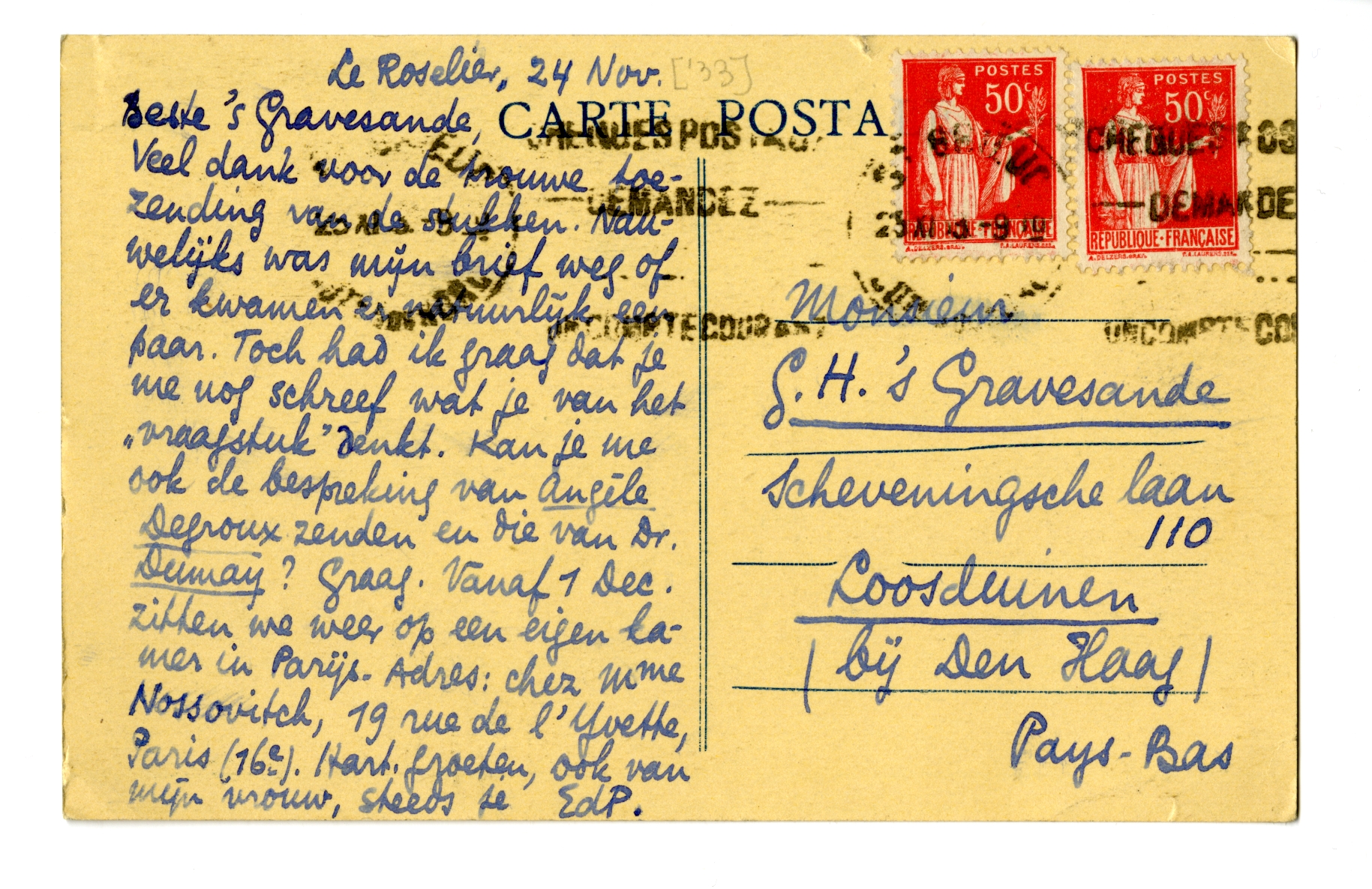 Veel dank voor de trouwe toezending van de stukken. Nauwelijks was mijn brief weg of er kwamen er natuurlijk een paar. Toch had ik graag dat je me nog schreef wat je van het ‘vraagstuk’ denkt. Kan je me ook de bespreking van Angèle Degroux2992 zenden en die van Dr. Dumay? Graag. Vanaf 1 Dec. zitten we weer op een eigen kamer in Parijs! Adres: chez Mme Nossovitch, 19 rue de l'Yvette, Paris (16e). Hart. groeten, ook van mijn vrouw, steeds je