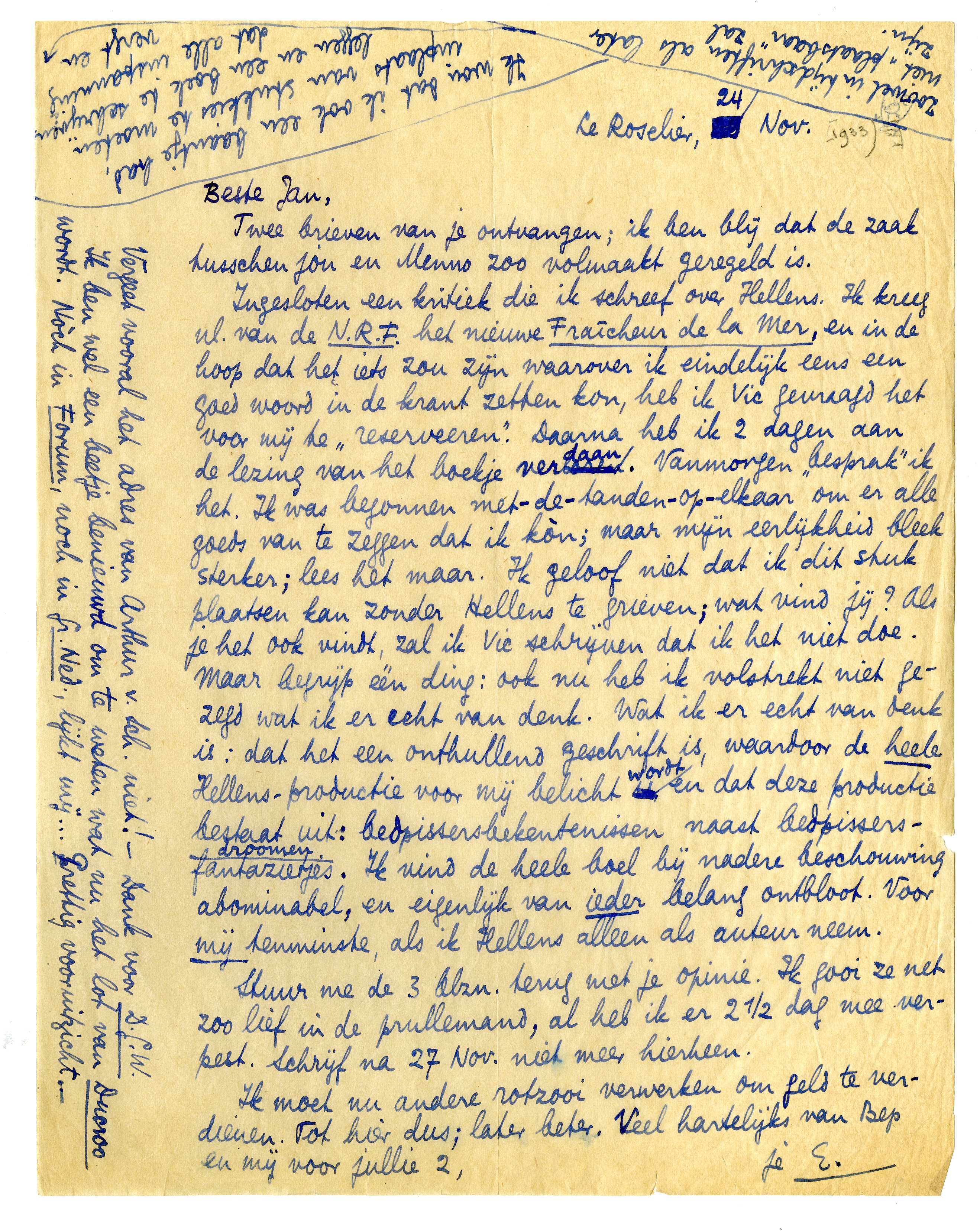 Ingesloten een kritiek die ik schreef over Hellens.2993 Ik kreeg nl. van de N.R.F. het nieuwe Fraîcheur de la Mer, en in de hoop dat het iets zou zijn waarover ik eindelijk eens een goed woord in de krant zetten kon, heb ik Vic gevraagd het voor mij te ‘reserveeren’. Daarna heb ik 2 dagen aan de lezing van het boekje verdaan. Vanmorgen ‘besprak’ ik het. Ik was begonnen met-de-tanden-op-elkaar om er alle goeds van te zeggen dat ik kòn; maar mijn eerlijkheid bleek sterker; lees het maar. Ik geloof niet dat ik dit stuk plaatsen kan zonder Hellens te grieven; wat vind jij? Als je het ook vindt zal ik Vic schrijven dat ik het niet doe. Maar begrijp één ding: ook nu heb ik volstrekt niet gezegd wat ik er echt van denk. Wat ik er echt van denk is: dat het een onthullend geschrift is, waardoor de heele Hellens-productie voor mij belicht wordt, en dat deze productie bestaat uit: bedpissersbekentenissen naast bedpissers-droomen/fantazietjes. Ik vind de heele boel bij nadere beschouwing abominabel, en eigenlijk van ieder belang ontbloot. Voor mij tenminste, als ik Hellens alleen als auteur neem.