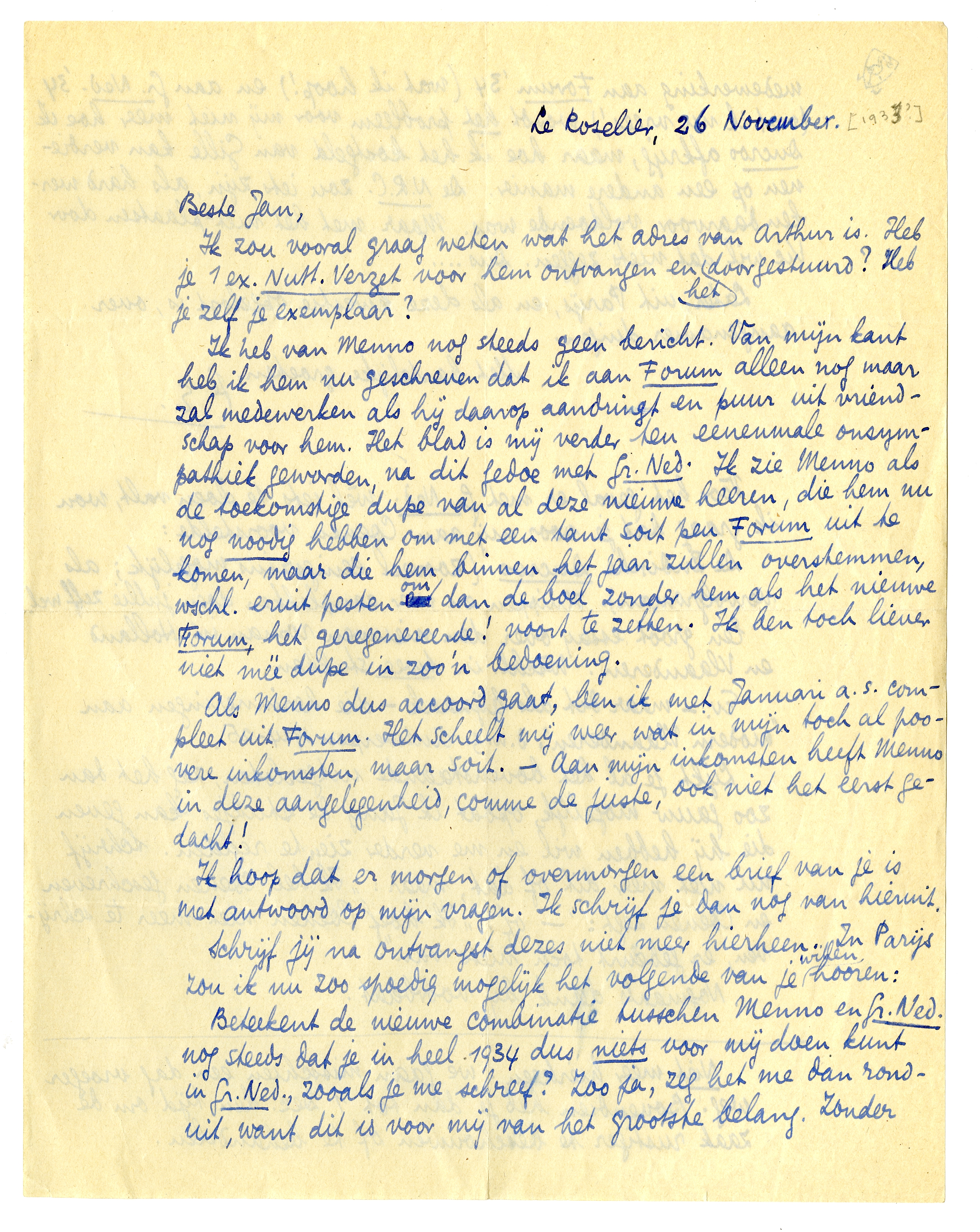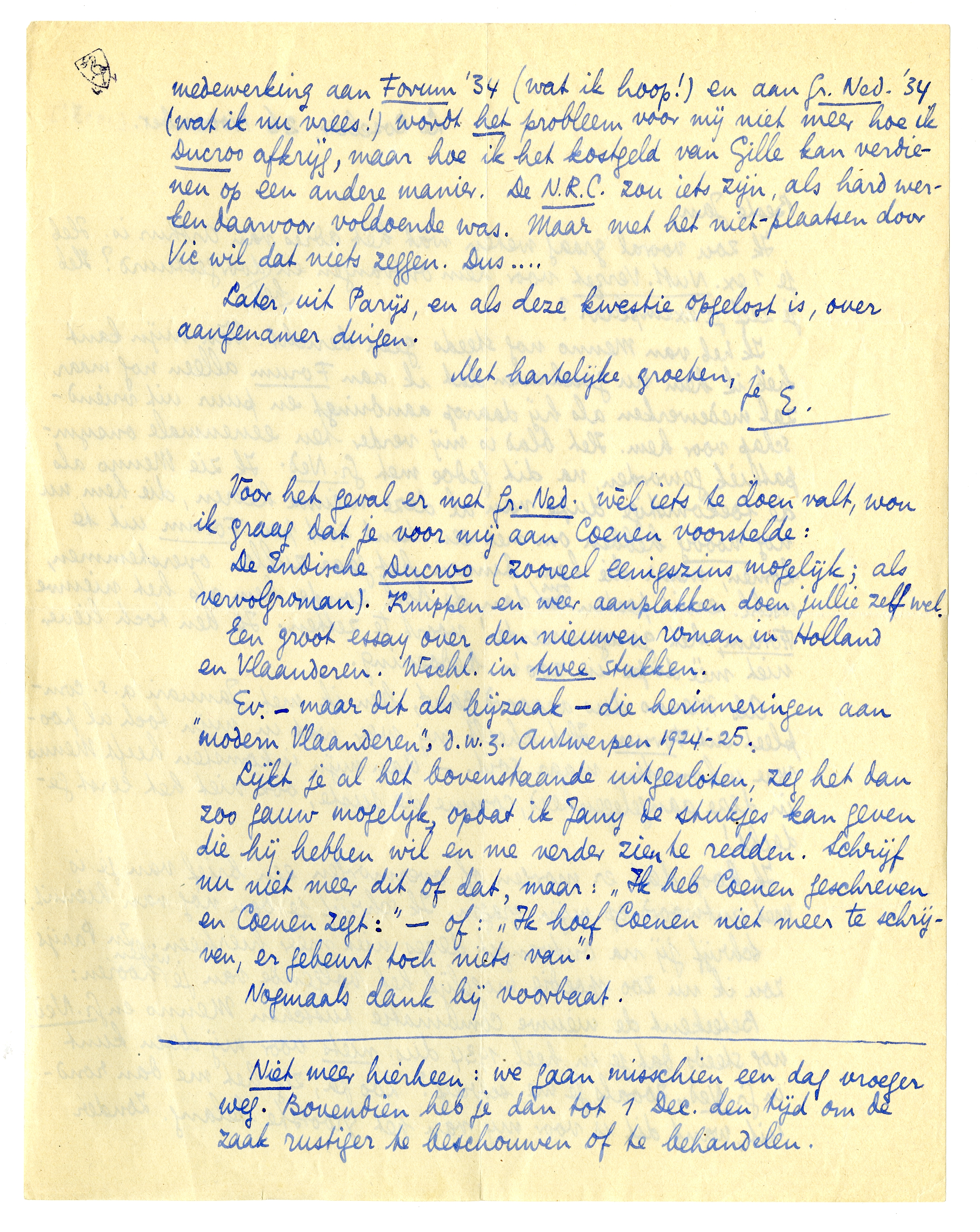 Beteekent de nieuwe combinatie tusschen Menno en Gr. Ned. nog steeds dat je in heel 1934 dus niets voor mij doen kunt in Gr. Ned., zooals je me schreef? Zoo ja, zeg het me dan ronduit, want dit is voor mij van het grootste belang. Zonder medewerking aan Forum '34 (wat ik hoop!) en aan Gr. Ned. '34 (wat ik nu vrees!) wordt het probleem voor mij niet meer hoe ik Ducroo afkrijg, maar hoe ik het kostgeld van Gille kan verdienen op een andere manier. De N.R.C. zou iets zijn, als hard werken daarvoor voldoende was. Maar met het niet-plaatsen door Vic wil dat niets zeggen. Dus....
