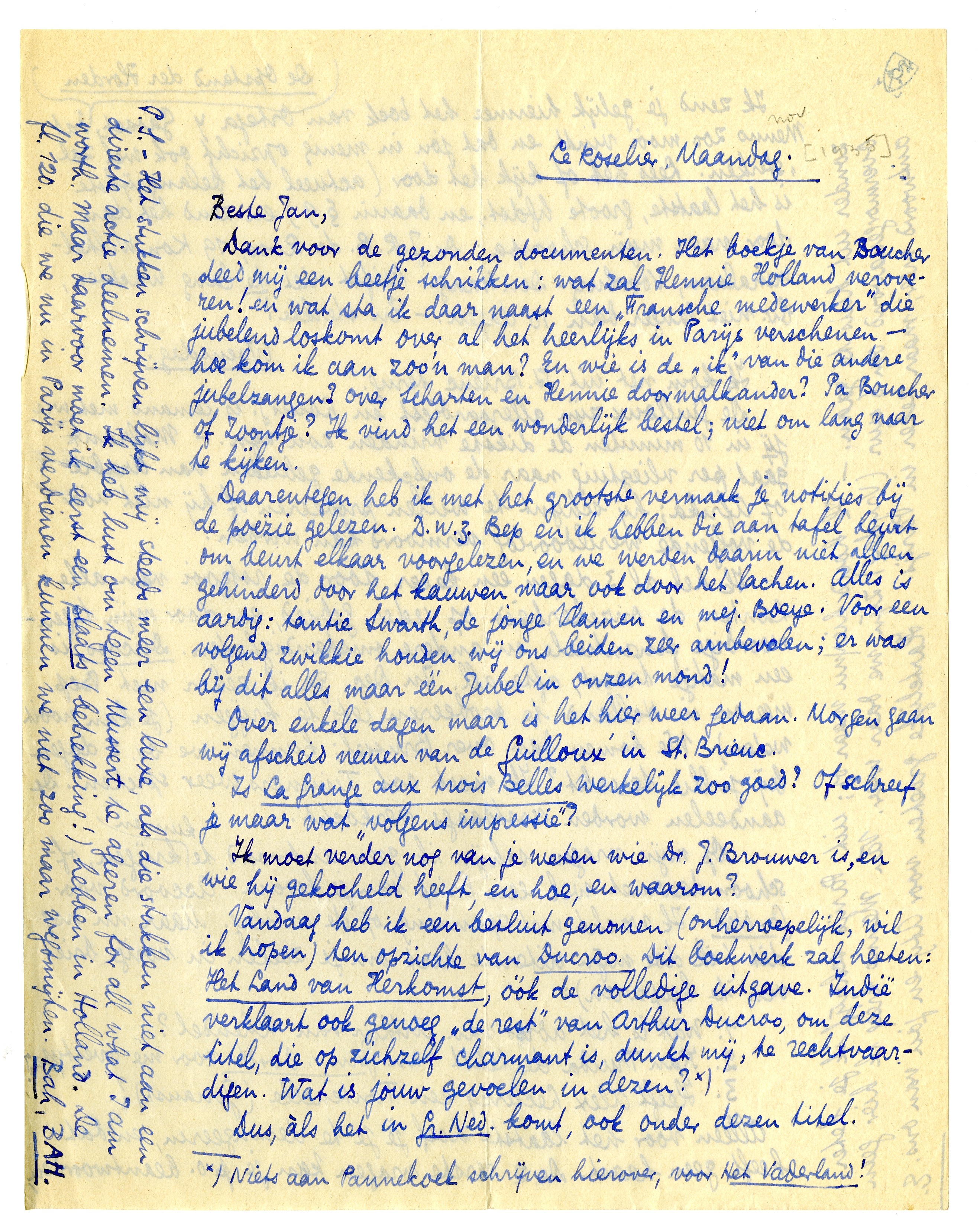Vandaag heb ik een besluit genomen (onherroepelijk, wil ik hopen) ten opzichte van Ducroo. Dit boekwerk zal heeten: Het Land van Herkomst, óók de volledige uitgave. Indië verklaart ook genoeg ‘de rest’ van Arthur Ducroo, om deze titel, die op zichzelf charmant is, dunkt mij, te rechtvaardigen. Wat is jouw gevoelen in dezen?* Dus, àls het in Gr. Ned. komt, ook onder dezen titel.