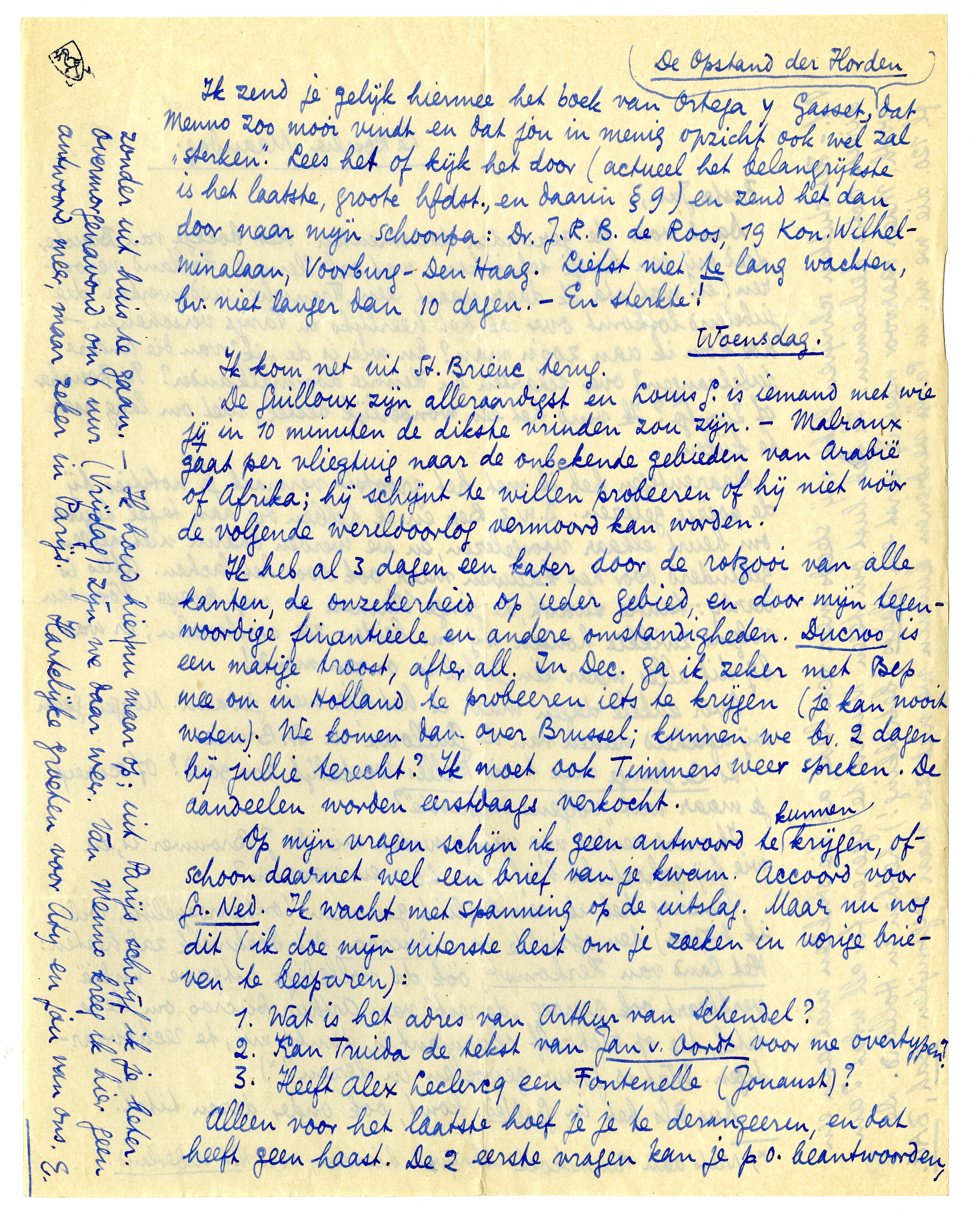 Ik zend je gelijk hiermee het boek van Ortega y Gasset, De Opstand der Horden dat Menno zoo mooi vindt en dat jou in menig opzicht ook wel zal ‘sterken’. Lees het of kijk het door (actueel het belangrijkste is het laatste, groote hfdst., en daarin §9) en zend het dan door naar mijn schoonpa: Dr. J.R.B. de Roos, 19 Kon. Wilhelminalaan, Voorburg-Den Haag. Liefst niet te lang wachten, bv. niet langer dan 10 dagen. - En sterkte!
