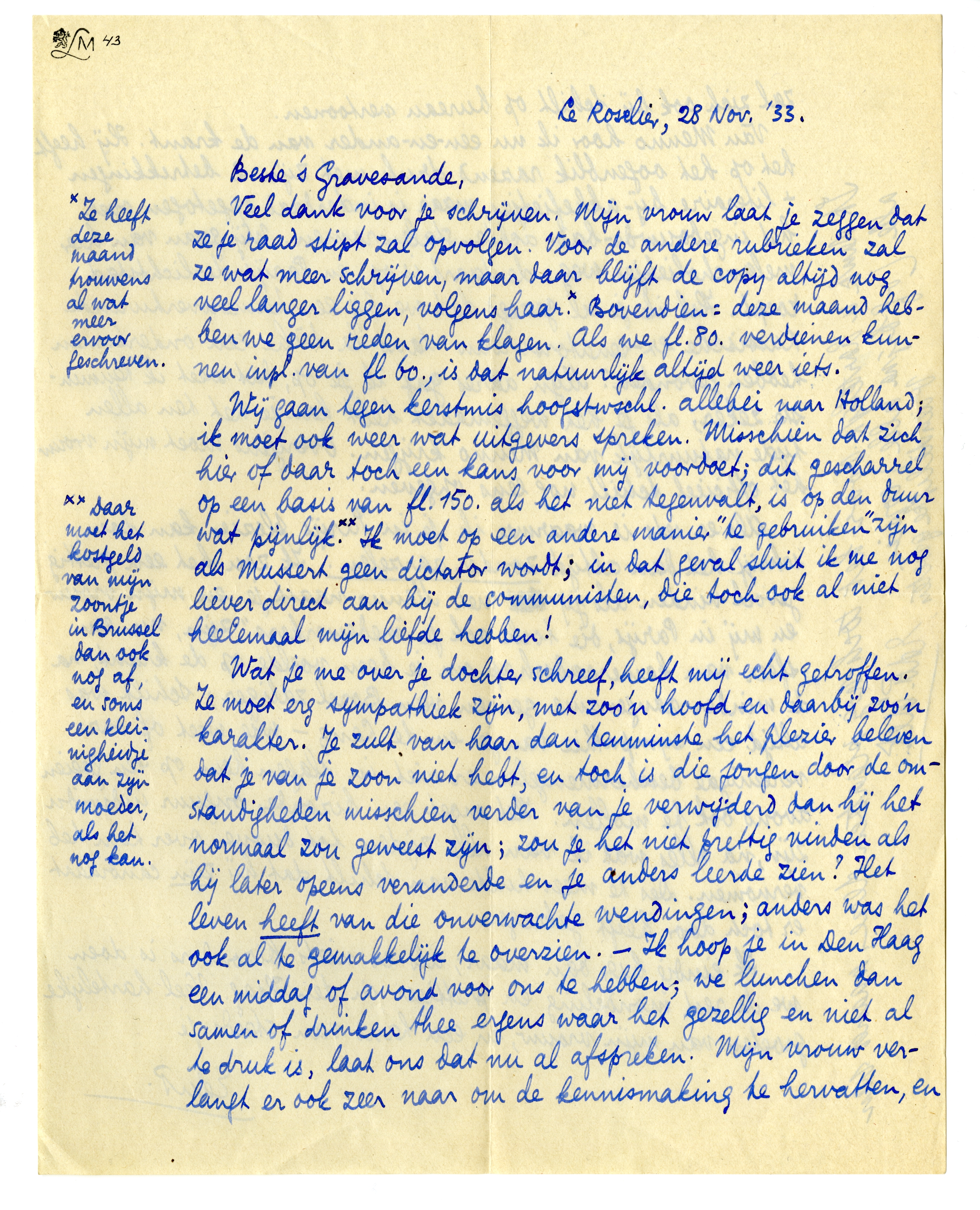 Wij gaan tegen kerstmis hoogstwschl. allebei naar Holland; ik moet ook weer wat uitgevers spreken. Misschien dat zich hier of daar toch een kans voor mij voordoet; dit gescharrel op een basis van fl. 150. als het niet tegenvalt, is op den duur wat pijnlijk.2998 Ik moet op een andere manier ‘te gebruiken’ zijn als Mussert geen dictator wordt; in dat geval sluit ik me nog liever direct aan bij de communisten, die toch ook al niet heelemaal mijn liefde hebben!