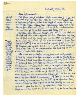 Wat je me over je dochter schreef, heeft mij echt getroffen. Ze moet erg sympathiek zijn, met zoo'n hoofd en daarbij zoo'n karakter. Je zult van haar dan tenminste het plezier beleven dat je van je zoon niet hebt, en toch is die jongen door de omstandigheden misschien verder van je verwijderd dan hij het normaal zou geweest zijn; zou je het niet prettig vinden als hij later opeens veranderde en je anders leerde zien? Het leven heeft van die onverwachte wendin-gen; anders was het ook al te gemakkelijk te overzien. - Ik hoop je in Den Haag een middag of avond voor ons te hebben; we lunchen dan samen of drinken thee ergens waar het gezellig en niet al te druk is, laat ons dat nu al afspreken. Mijn vrouw verlangt er ook zeer naar om de kennismaking te hervatten, en zal zich ook bij Schilt op bureau vertoonen.