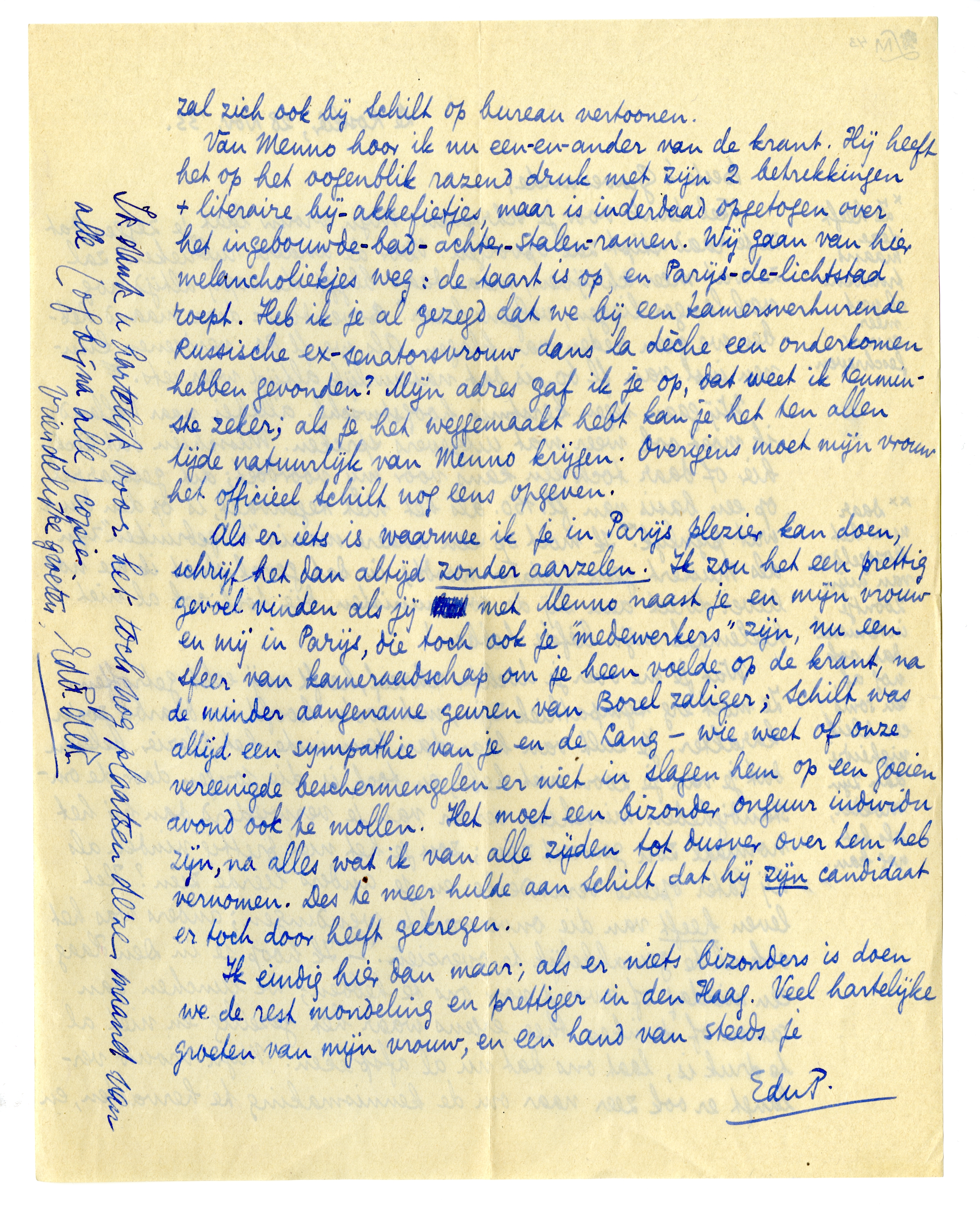 Als er iets is waarmee ik je in Parijs plezier kan doen, schrijf het dan altijd zonder aarzelen. Ik zou het een prettig gevoel vinden als jij met Menno naast je en mijn vrouw en mij in Parijs, die toch ook je ‘medewerkers’ zijn, nu een sfeer van kameraadschap om je heen voelde op de krant, na de minder aangename geuren van Borel zaliger; Schilt was altijd een sympathie van je en de Lang - wie weet of onze vereenigde beschermengelen er niet in slagen hem op een goeien avond ook te mollen. Het moet een bizonder onguur individu zijn, na alles wat ik van alle zijden tot dusver over hem heb vernomen. Des te meer hulde aan Schilt dat hij zijn candidaat er toch door heeft gekregen.
