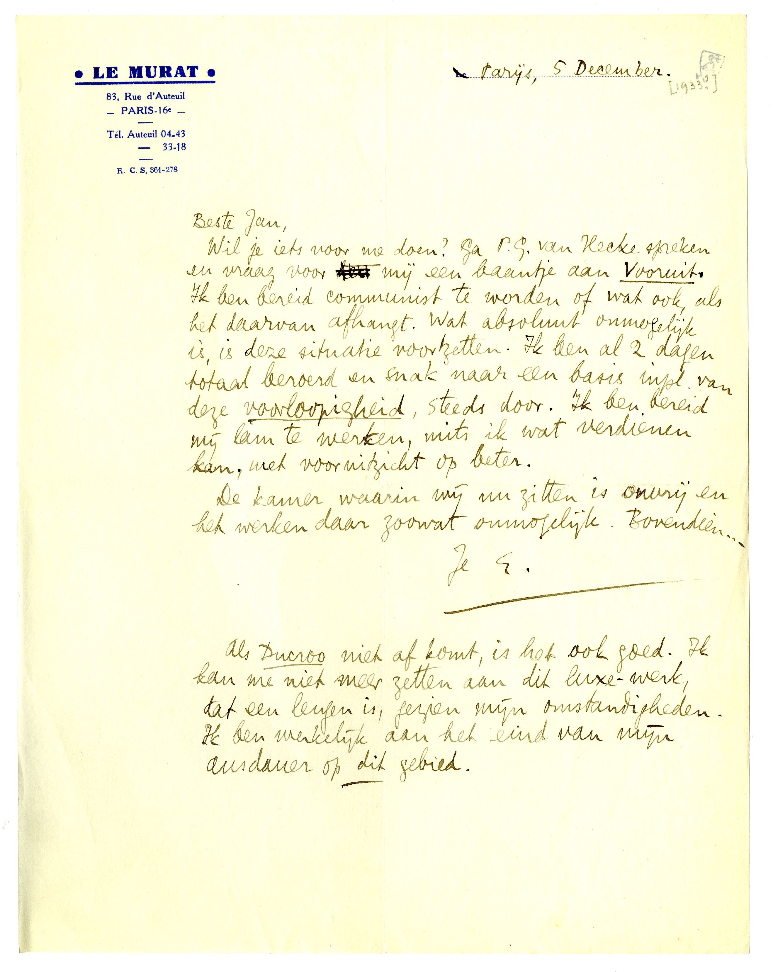Wil je iets voor me doen? Ga P.G. van Hecke spreken en vraag voor mij een baantje aan Vooruit. Ik ben bereid communist te worden of wat ook, als het daarvan afhangt. Wat absoluut onmogelijk is, is deze situatie voortzetten. Ik ben al 2 dagen totaal beroerd en snak naar een basis inpl. van deze voorloopigheid, steeds door. Ik ben bereid mij lam te werken, mits ik wat verdienen kan, met vooruitzicht op heter.