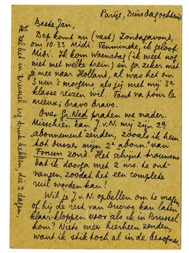 Bep komt nu (vast) Zondagavond, om 10.33 Midi. Tenminste, ik geloof: Midi. Ik kom Woensdag (ik weet nog niet met welke trein) en ga zeker met je mee naar Holland, al was het om 3 uur 's morgens, als jij met mij 3e klasse reizen wil. Tout va pour le mieux; bravo bravo.