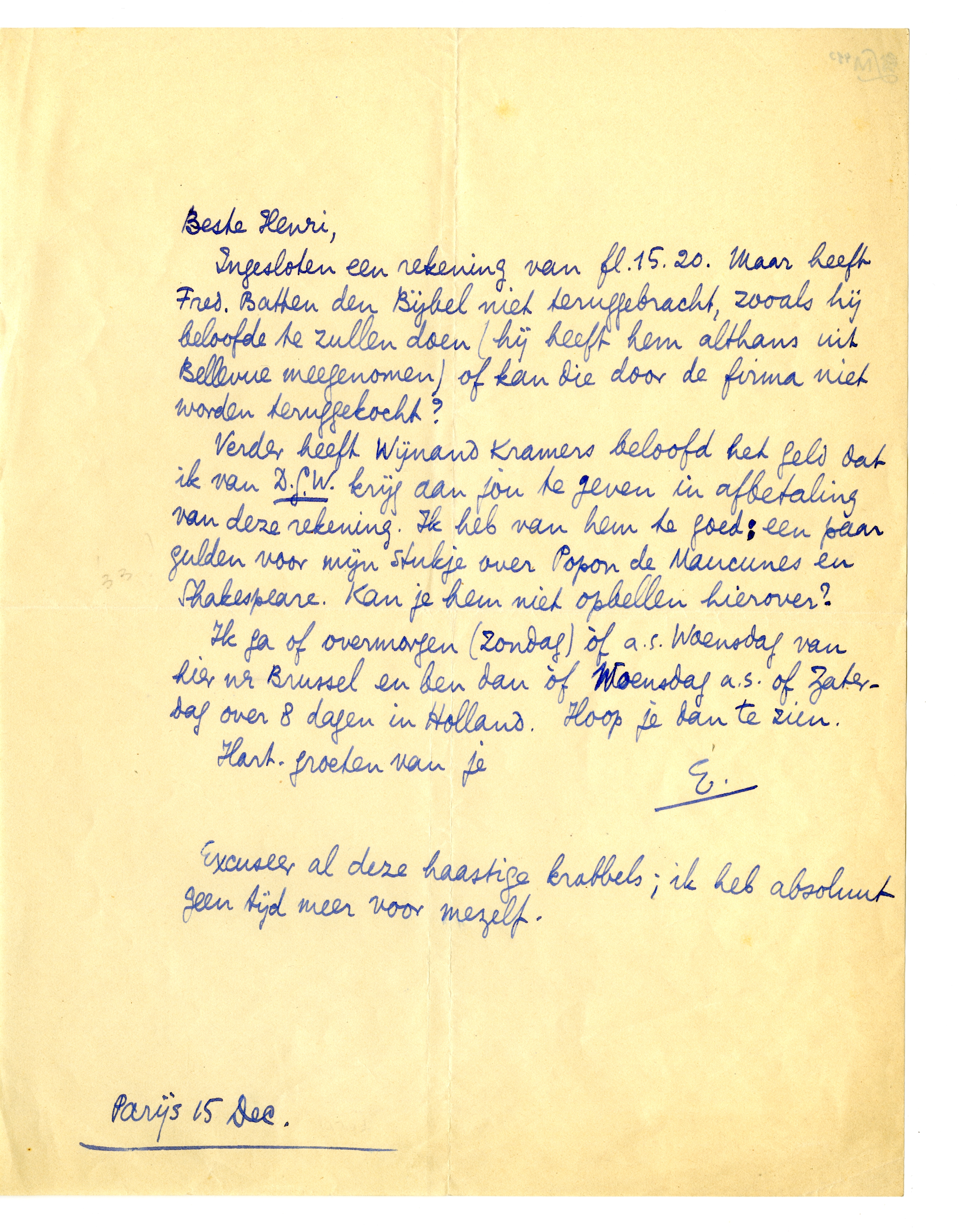 Verder heeft Wijnand Kramers beloofd het geld dat ik van D.G.W. krijg aan jou te geven in afbetaling van deze rekening. Ik heb van hem te goed: een paar gulden voor mijn stukje over Popon de Maucunes en Shakespeare.3021 Kan je hem niet opbellen hierover?
