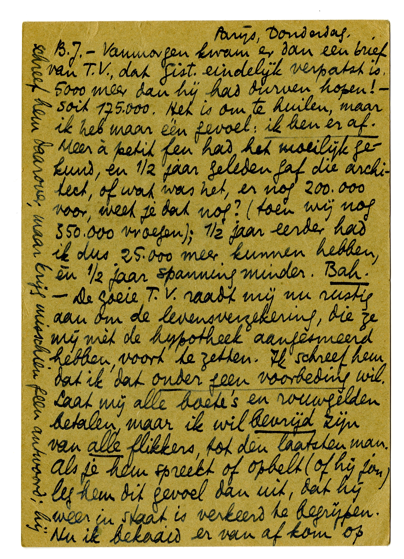 B.J. - Vanmorgen kwam er dan een brief van T.V., dat Gist. eindelijk verpatst is. 5000 meer dan hij had durven hopen! - soit 175.000. Het is om te huilen, maar ik heb maar één gevoel: ik ben er af. Meer à petit feu had het moeilijk gekund, en ½ jaar geleden gaf die architect, of wat was het, er nog 200.000 voor, weet je dat nog? (toen wij nog 350.000 vroegen); ½ jaar eerder had ik dus 25.000 meer kunnen hebben, èn ½ jaar spanning minder. Bah. - De goeie T.V. raadt mij nu rustig aan om de levensverzekering, die ze mij mèt de hypotheek aangesmeerd hebben, voort te zetten. Ik schreef hem dat ik dat onder geen voorbeding wil. Laat mij alle boete's en rouwgelden betalen, maar ik wil bevrijd zijn van alle flikkers, tot den laatsten man. Als je hem spreekt of opbelt (of hij jou) leg hem dit gevoel dan uit, dat hij weer in staat is verkeerd te begrijpen. Nu ik bekaaid er van af kom op ongeveer ieder financieel terrein, wil ik althans ‘moreel’ kunnen herademen. Ik wil en moet dus van alles af. - Ik voel mij deze laatste dagen weer zoo moe en beroerd, dat Bep besloten heeft deze week-end nr Bellevue te gaan om uit te rusten (dat kàn hier gewoon niet, met de Russen). Aan Malraux werk ik als met kiespijn, mijn hoofd is ook te belabberd ervoor. Later beter. Informeer ook bij T.V. wanneer ik nu het geld zal ontvangen. Ik schreef hem daarover, maar krijg misschien geen antwoord; hij heeft mij zelfs niet gezegd wie de kooper is, en ik wil dat nu ook niet vragen. Schrijf gauw eens.