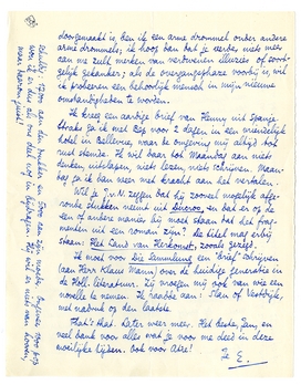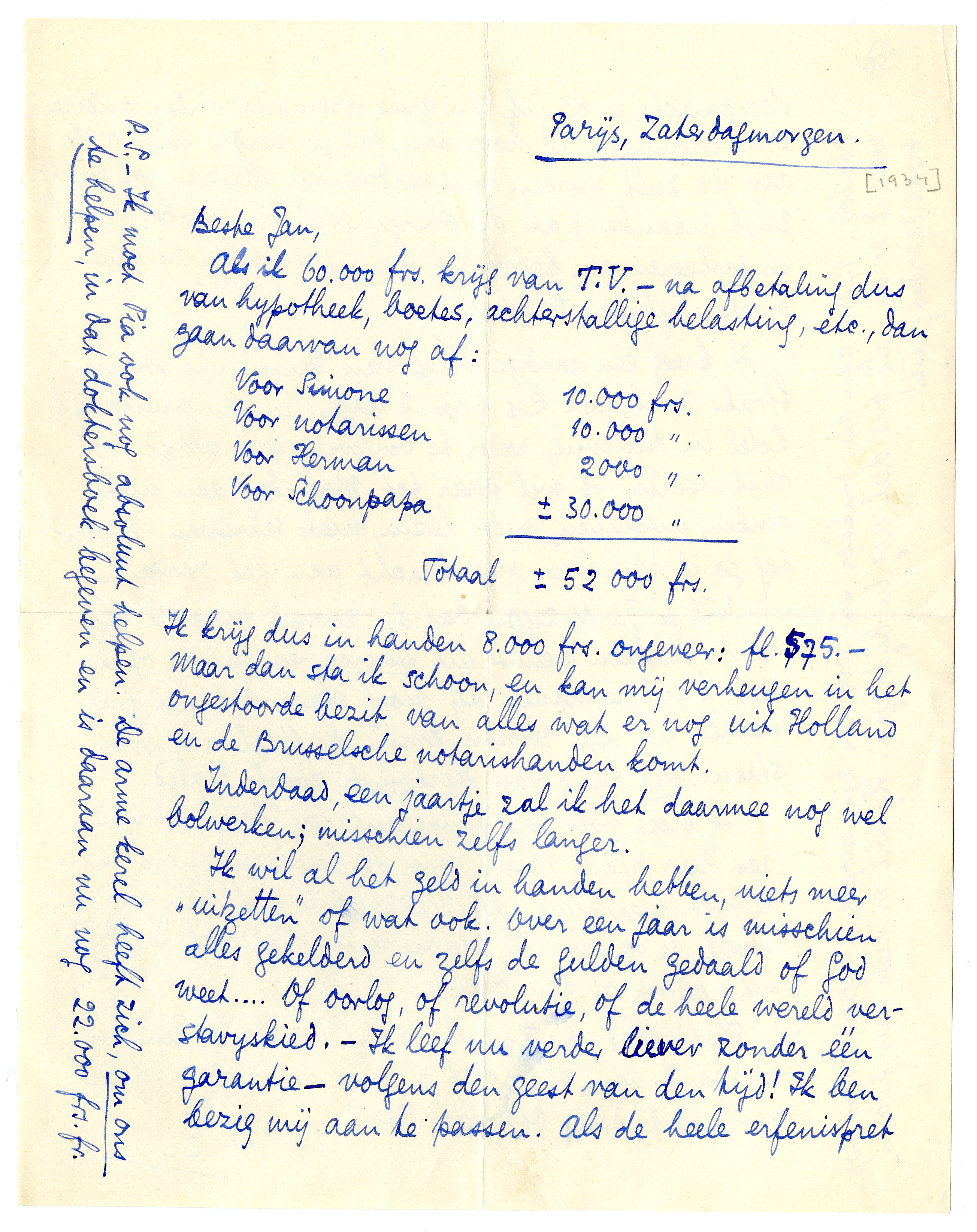 P.S. - Ik moet Pia ook nog absoluut helpen. De arme kerel heeft zich, om ons te helpen, in dat doktersboek begeven en is daaraan nu nog 22.000 frs. fr. schuldig: 17.000 aan den drukker en 5.000 aan zijn moeder. Ongeveer 1000 pop wou ik er dus als ons deel nog in bijdragen. Hij wil er niets van hooren, maar daarom juist!