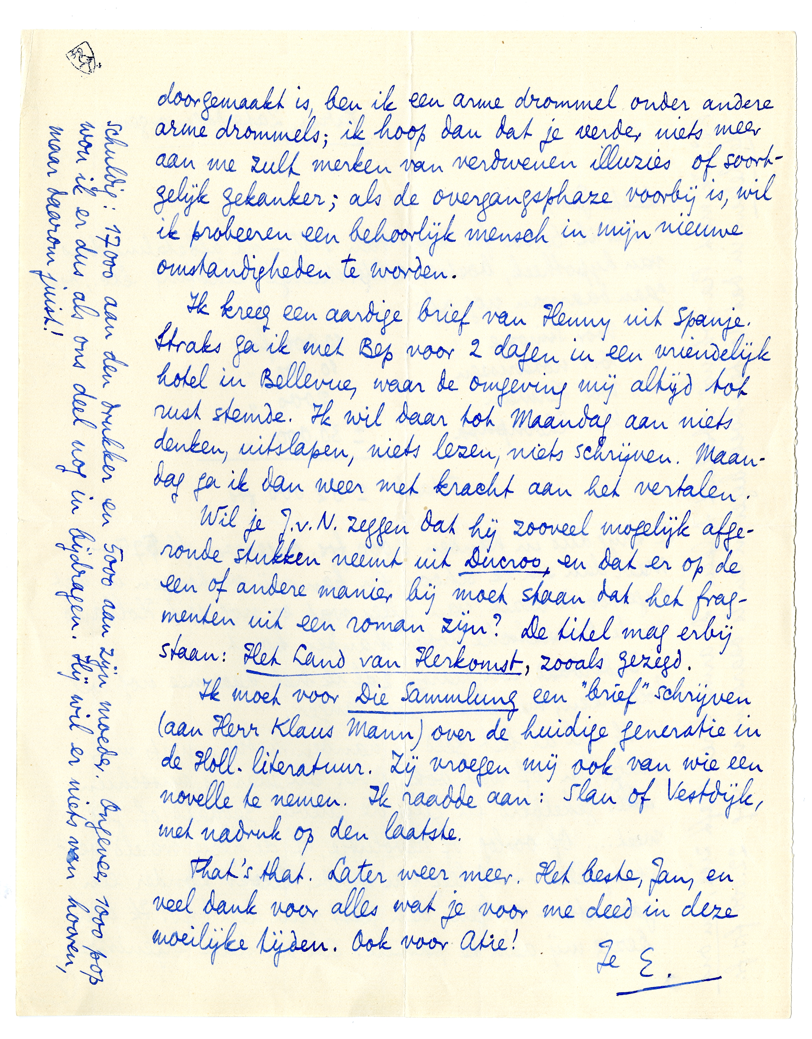 Wil je J.v.N. zeggen dat hij zooveel mogelijk afgeronde stukken3044 neemt uit Ducroo, en dat er op de een of andere manier bij moet staan dat het fragmenten uit een roman zijn? De titel mag erbij staan: Het Land van Herkomst, zooals gezegd.
