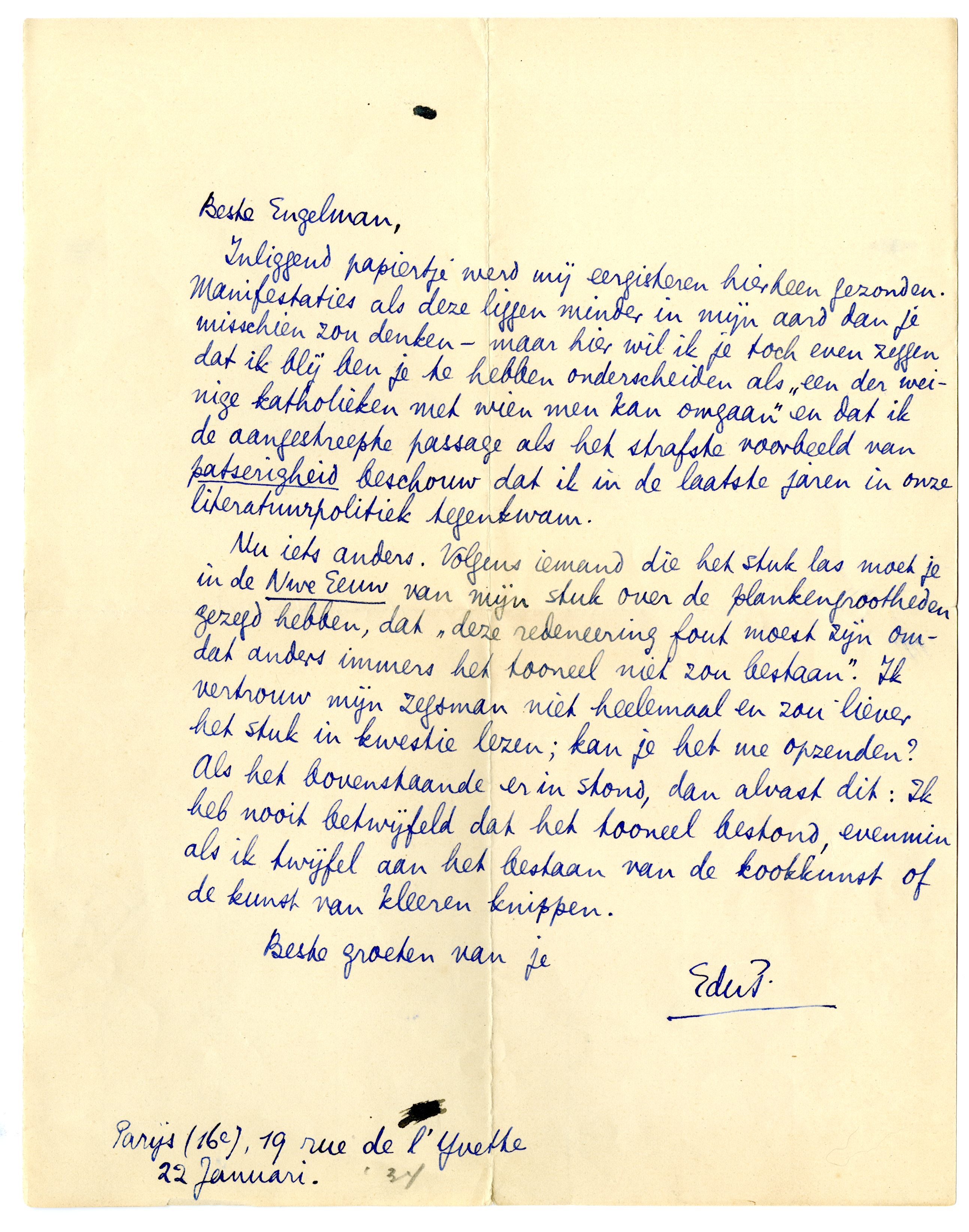 Inliggend papiertje3046 werd mij eergisteren hierheen gezonden. Manifestaties als deze liggen minder in mijn aard dan je misschien zou denken - maar hier wil ik je toch even zeggen dat ik blij ben je te hebben onderscheiden als ‘een der weinige katholieken met wien men kan omgaan’ en dat ik de aangestreepte passage als het strafste voorbeeld van patserigheid beschouw dat ik in de laatste jaren in onze literatuurpolitiek tegenkwam.