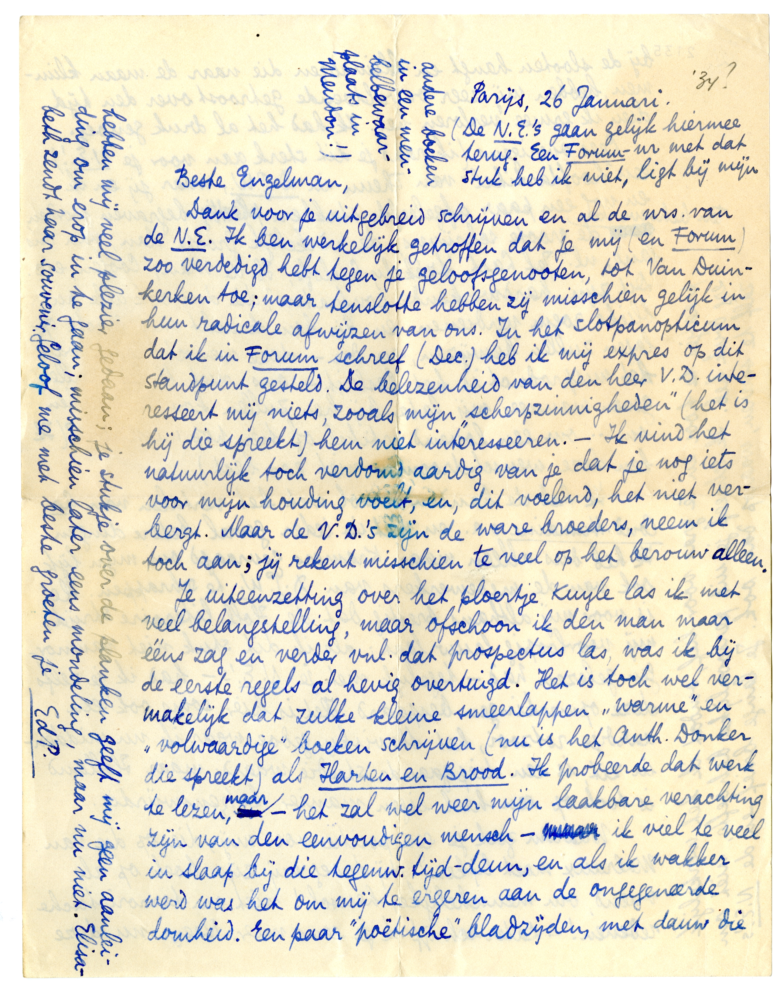 Dank voor je uitgebreid schrijven en al de nrs. van de N.E. Ik ben werkelijk getroffen dat je mij (en Forum) zoo verdedigd hebt3050 tegen je geloofsgenooten, tot Van Duinkerken toe3051; maar tenslotte hebben zij misschien gelijk in hun radicale afwijzen van ons. In het slot-panopticum dat ik in Forum schreef (Dec.) heb ik mij expres op dit standpunt gesteld. De belezenheid van den heer V.D. interesseert mij niets, zooals mijn ‘scherpzinnigheden’ (het is hij die spreekt) hem niet interesseeren. - Ik vind het natuurlijk toch verdomd aardig van je dat je nog iets voor mijn houding voelt, en, dit voelend, het niet verbergt. Maar de V.D.'s zijn de ware broeders, neem ik toch aan; jij rekent misschien te veel op het berouw alleen.