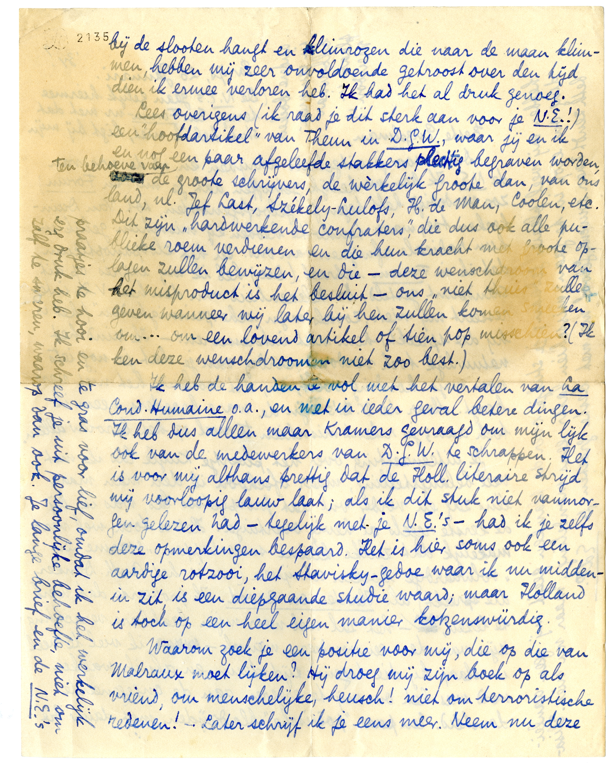 Ik heb de handen te vol met het vertalen van La Cond. Humaine o.a., en met in ieder geval betere dingen. Ik heb dus alleen maar Kramers gevraagd om mijn lijk ook van de medewerkers van D.G.W. te schrappen.3054 Het is voor mij althans prettig dat de Holl. literaire strijd mij voorloopig lauw laat; als ik dit stuk niet vanmorgen gelezen had - tegelijk met je N.E.'s - had ik je zelfs deze opmerkingen bespaard. Het is hier soms ook een aardige rotzooi, het Stavisky-gedoe waar ik nu middenin zit is een diepgaande studie waard; maar Holland is toch op een heel eigen manier kotzenswürdig.