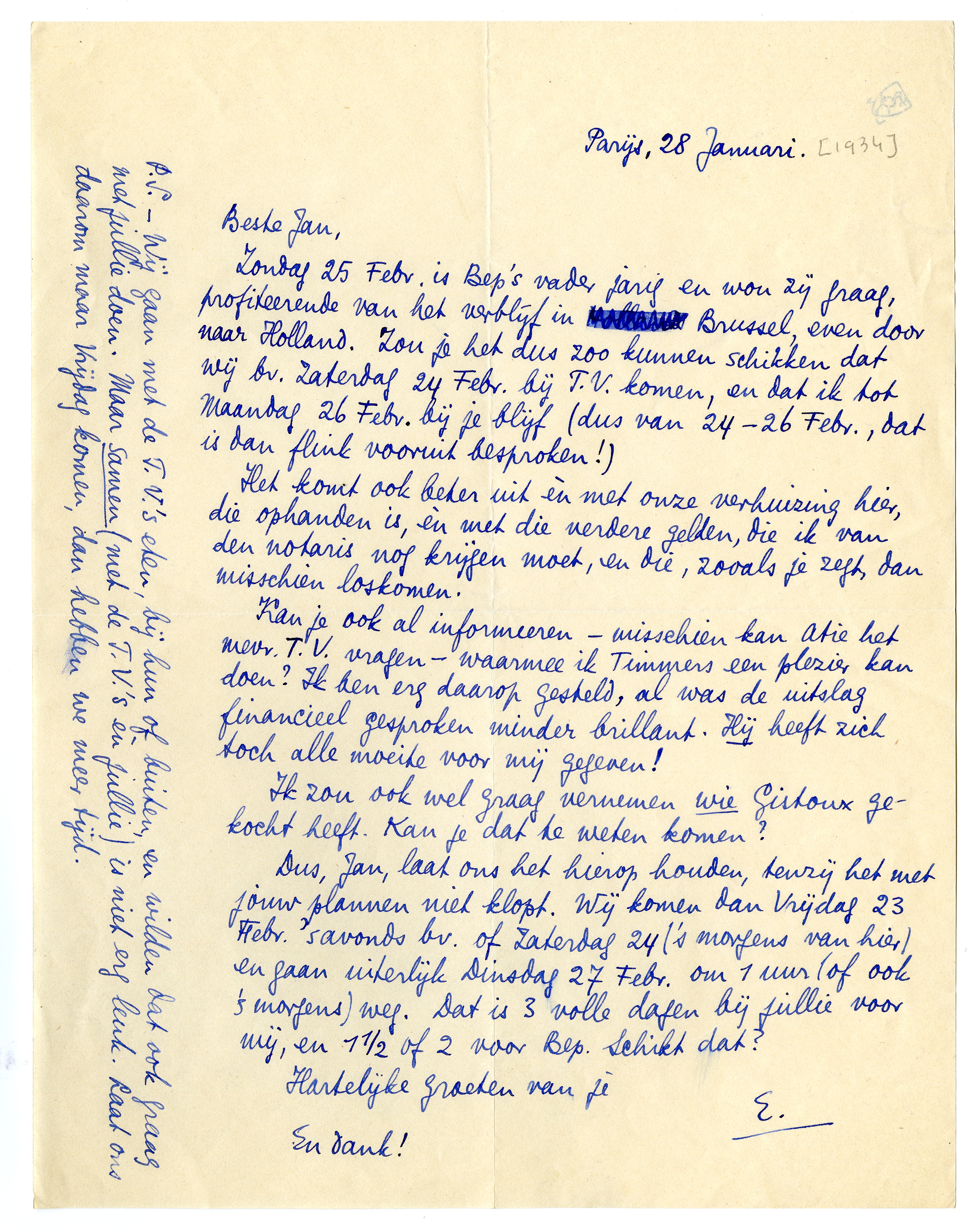 Zondag 25 Febr. is Bep's vader jarig en wou zij graag, profiteerende van het verblijf in Brussel, even door naar Holland. Zou je het dus zoo kunnen schikken dat wij bv. Zaterdag 24 Febr. bij T.V. komen, en dat ik tot Maandag 26 Febr. bij je blijf (dus van 24-26 Febr., dat is dan flink vooruit besproken!)