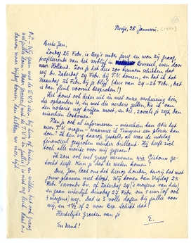 Dus, Jan, laat ons het hierop houden, tenzij het met jouw plannen niet klopt. Wij komen dan Vrijdag 23 Febr. 's avonds bv. of Zaterdag 24 ('s morgens van hier) en gaan uiterlijk Dinsdag 27 Febr. om 1 uur (of ook 's morgens) weg. Dat is 3 volle dagen bij jullie voor mij, en 1½ of 2 voor Bep. Schikt dat?