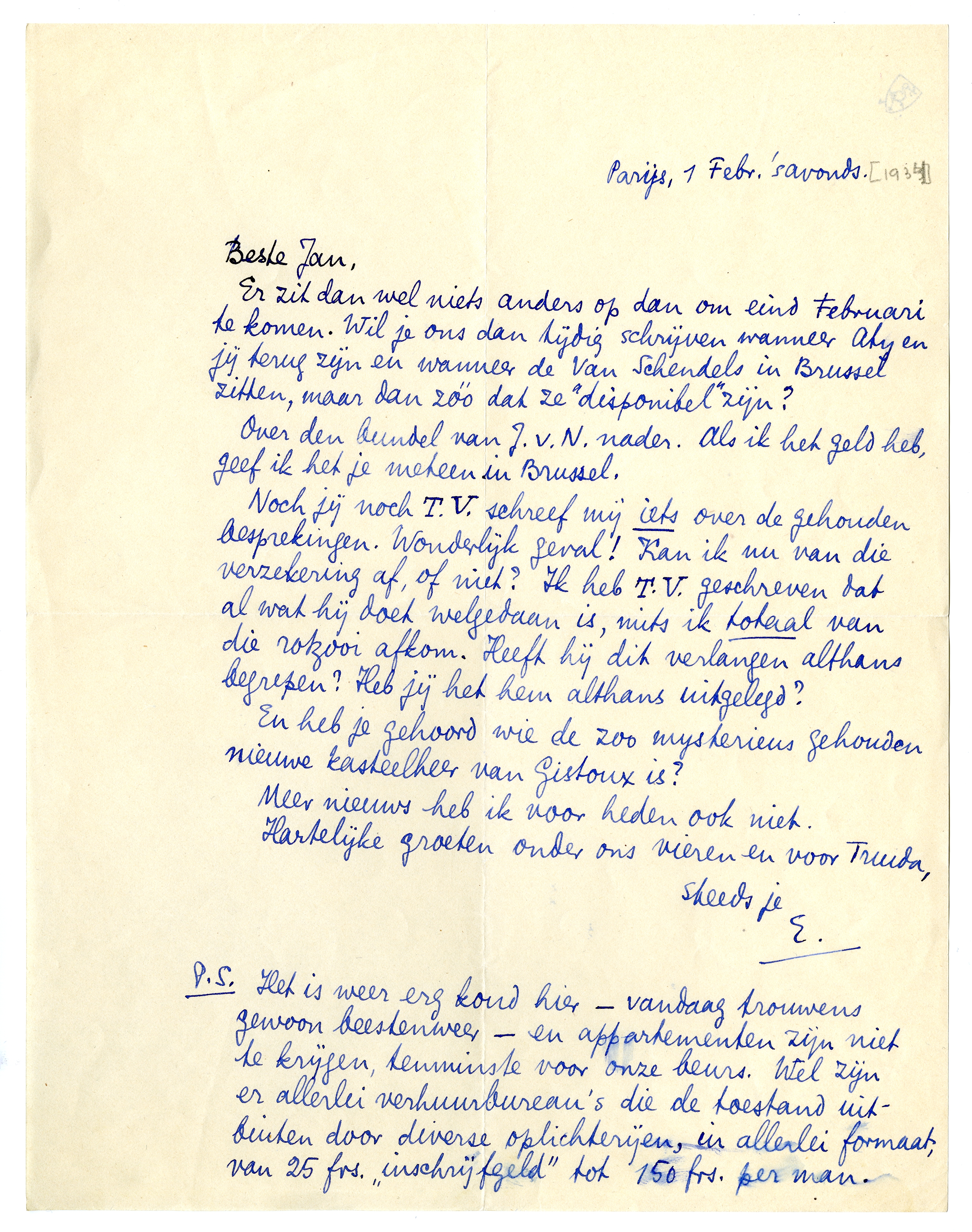 Er zit dan wel niets anders op dan om eind Februari te komen. Wil je ons dan tijdig schrijven wanneer Aty en jij terug zijn en wanneer de Van Schendels in Brussel zitten, maar dan zóó dat ze ‘disponibel’ zijn?