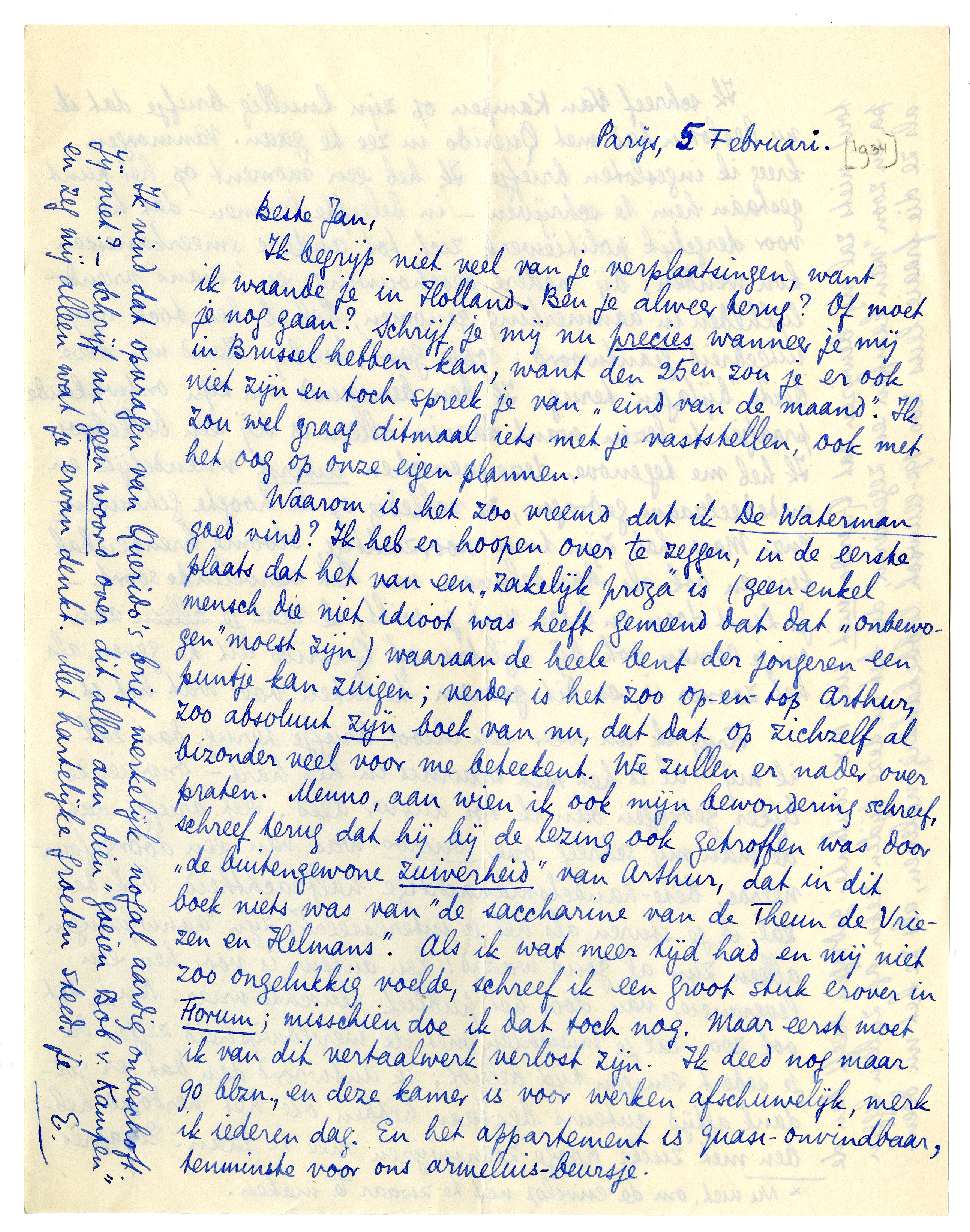 Waarom is het zoo vreemd dat ik De Waterman goed vind? Ik heb er hoopen over te zeggen, in de eerste plaats dat het van een ‘zakelijk proza’ is (geen enkel mensch die niet idioot was heeft gemeend dat dat ‘onbewogen’ moest zijn) waaraan de heele bent derjongeren een puntje kan zuigen; verder is het zoo op-en-top Arthur, zoo absoluut zijn boek van nu, dat dat op zichzelf al bizonder veel voor me beteekent. We zullen er nader over praten. Menno, aan wien ik ook mijn bewondering schreef, schreef terug3061 dat hij bij de lezing ook getroffen was door ‘de buitengewone zuiverheid’ van Arthur, dat in dit boek niets was van ‘de saccharine van de Theun de Vriezen en Helmans'. Als ik wat meer tijd had en mij niet zoo ongelukkig voelde, schreef ik een groot stuk erover in Forum; misschien doe ik dat toch nog. Maar eerst moet ik van dit vertaalwerk verlost zijn. Ik deed nog maar 90 blzn., en deze kamer is voor werken afschuwelijk, merk ik iederen dag. En het appartement is quasi-onvindbaar, tenminste voor ons armeluis-beursje.