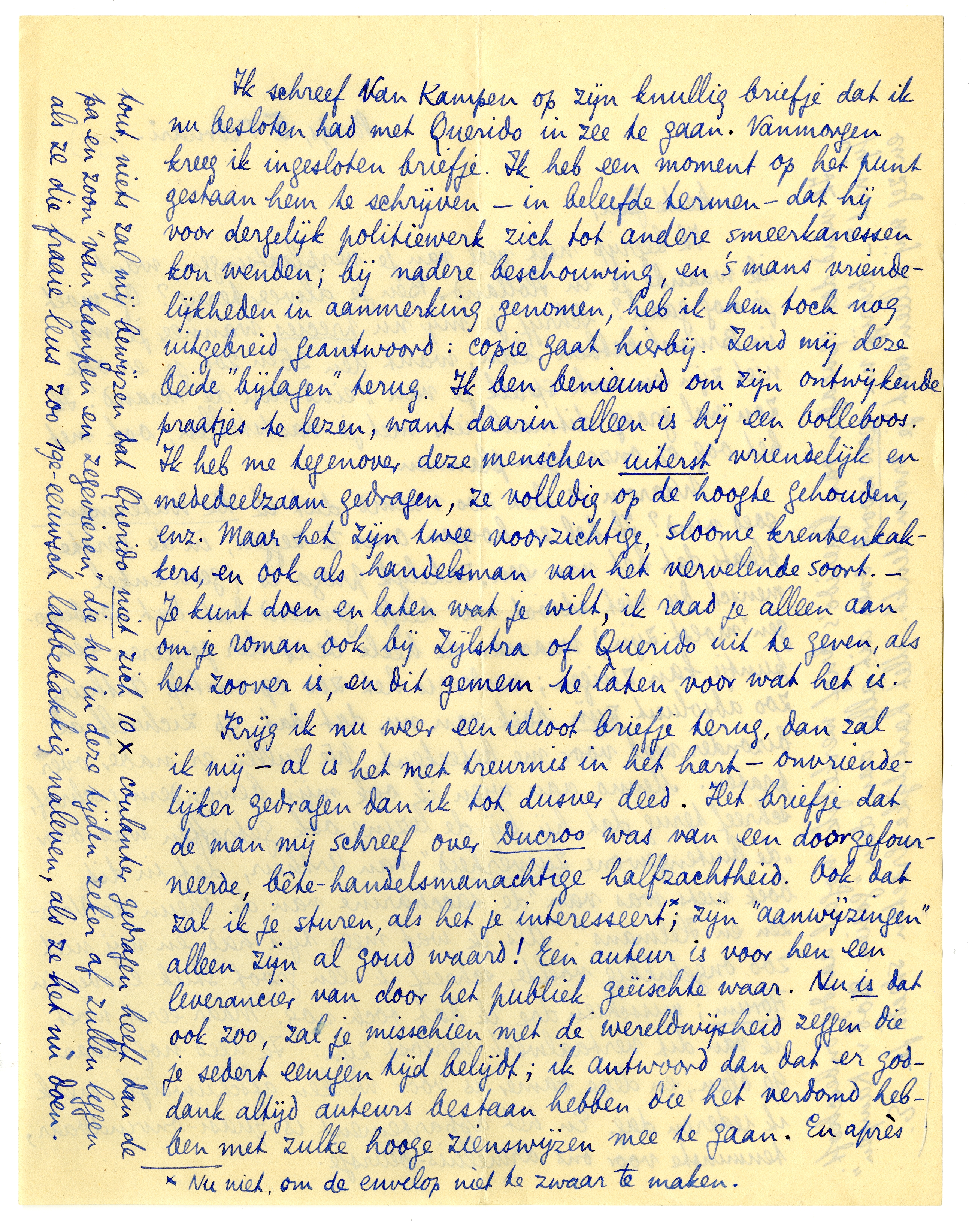 Ik schreef Van Kampen op zijn knullig briefje dat ik nu besloten had met Querido in zee te gaan. Vanmorgen kreeg ik ingesloten briefje. Ik heb een moment op het punt gestaan hem te schrijven - in beleefde termen - dat hij voor dergelijk politiewerk zich tot andere smeerkanessen kon wenden; bij nadere beschouwing, en 's mans vriendelijkheden in aanmerking genomen, heb ik hem toch nog uitgebreid geantwoord: copie gaat hierbij.3062 Zend mij deze beide ‘bijlagen’ terug. Ik ben benieuwd om zijn ontwijkende praatjes te lezen, want daarin alleen is hij een bolleboos. Ik heb me tegenover deze menschen uiterst vriendelijk en mededeelzaam gedragen, ze volledig op de hoogte gehouden, enz. Maar het zijn twee voorzichtige, sloome krentenkakkers, en ook als handelsman van het vervelende soort. - Je kunt doen en laten wat je wilt, ik raad je alleen aan om je roman ook bij Zijlstra of Querido uit te geven, als het zoover is, en dit gemem te laten voor wat het is.