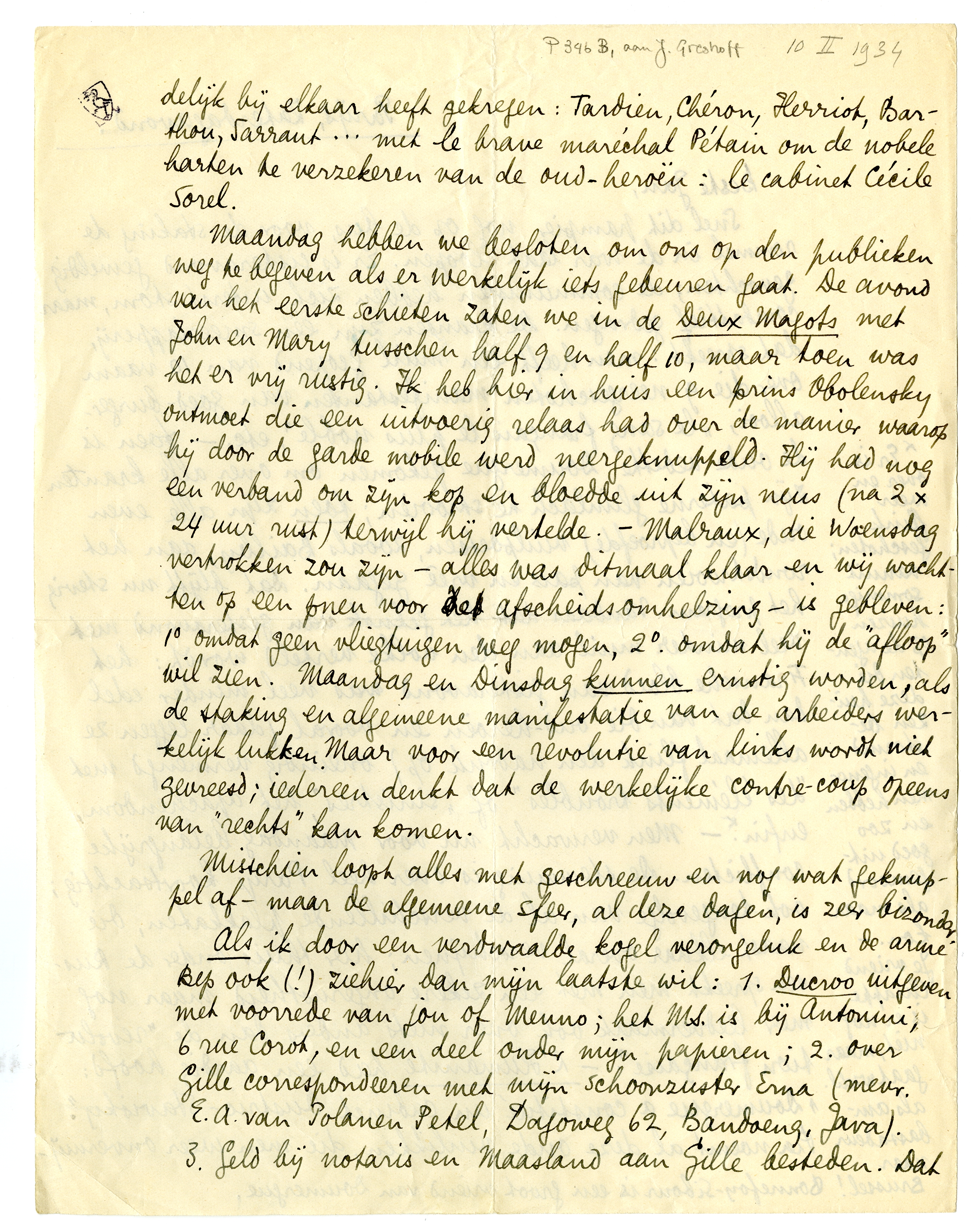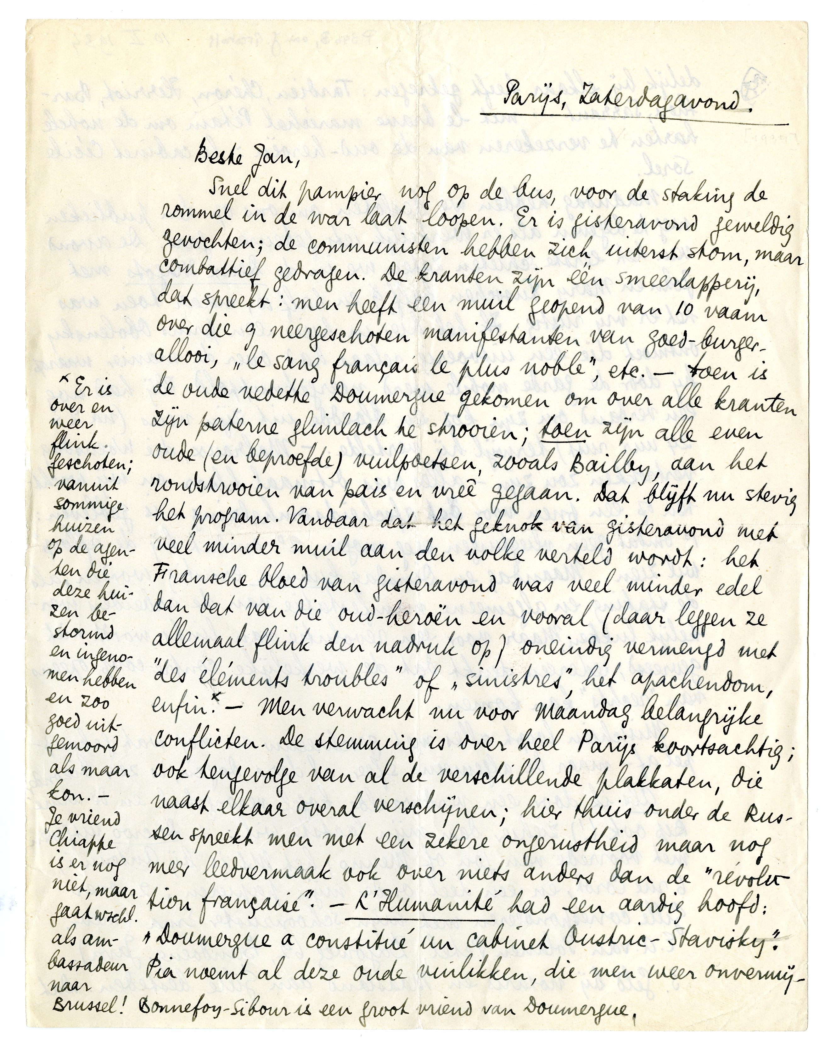 Snel dit pampier nog op de bus, voor de staking de rommel in de war laat loopen. Er is gisteravond geweldig gevochten3064; de communisten hebben zich uiterst stom, maar combattief gedragen. De kranten zijn één smeerlapperij, dat spreekt: men heeft een muil geopend van 10 vaam over die 9 neergeschoten manifestanten van goed-burger-allooi, ‘le sang français le plus noble’, etc. - toen is de oude vedette Doumergue gekomen om over alle kranten zijn paterne glimlach te strooien; toen zijn alle oude (en beproefde) vuilpoetsen, zooals Bailby, aan het rondstrooien van pais en vreê gegaan. Dat blijft nu stevig het program. Vandaar dat het geknok van gisteravond met veel minder muil aan den volke verteld wordt: het Fransche bloed van gisteravond was veel minder edel dan dat van die oud-heroën en vooral (daar leggen ze allemaal flink den nadruk op) oneindig vermengd met ‘des éléments troubles’ of ‘sinistres’, het apachendom, enfin.* - Men verwacht nu voor Maandag belangrijke conflicten. De stemming is over heel Parijs koortsachtig; ook tengevolge van al de verschillende plakkaten, die naast elkaar overal verschijnen; hier thuis onder de Russen spreekt men met een zekere ongerustheid maar nog meer leedvermaak ook over niets anders dan de ‘révolution française’. - L'Humanité had een aardig hoofd: ‘Doumergue a constitué un cabinet Oustric3066-Stavisky’. Pia noemt al deze oude vuilikken, die men weer onvermijdelijk bij elkaar heeft gekregen: Tardieu, Chéron, Herriot, Barthou, Sarraut... met le brave maréchal Pétain3067 om de nobele harten te verzekeren van de oud-heroën: le cabinet Cécile Sorel.