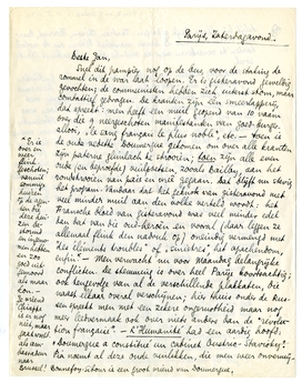 Maandag hebben we besloten om ons op den publieken weg te begeven als er werkelijk iets gebeuren gaat. De avond van het eerste schieten zaten we in de Deux Magots met John en Mary tusschen half 9 en half 10, maar toen was het er vrij rustig. Ik heb hier in huis een prins Obolensky ontmoet die een uitvoerig relaas had over de manier waarop hij door de garde mobile werd neergeknuppeld. Hij had nog een verband om zijn kop en bloedde uit zijn neus (na 2 × 24 uur rust) terwijl hij vertelde. - Malraux, die Woensdag vertrokken zou zijn - alles was ditmaal klaar en wij wachtten op een pneu voor de afscheidsomhelzing - is gebleven: 1e omdat geen vliegtuigen weg mogen, 2e. omdat hij de ‘afloop’ wil zien. Maandag en Dinsdag kunnen ernstig worden, als de staking en algemeene manifestatie van de arbeiders werkelijk lukken. Maar voor een revolutie van links wordt niet gevreesd; iedereen denkt dat de werkelijke contre-coup opeens van ‘rechts’ kan komen.