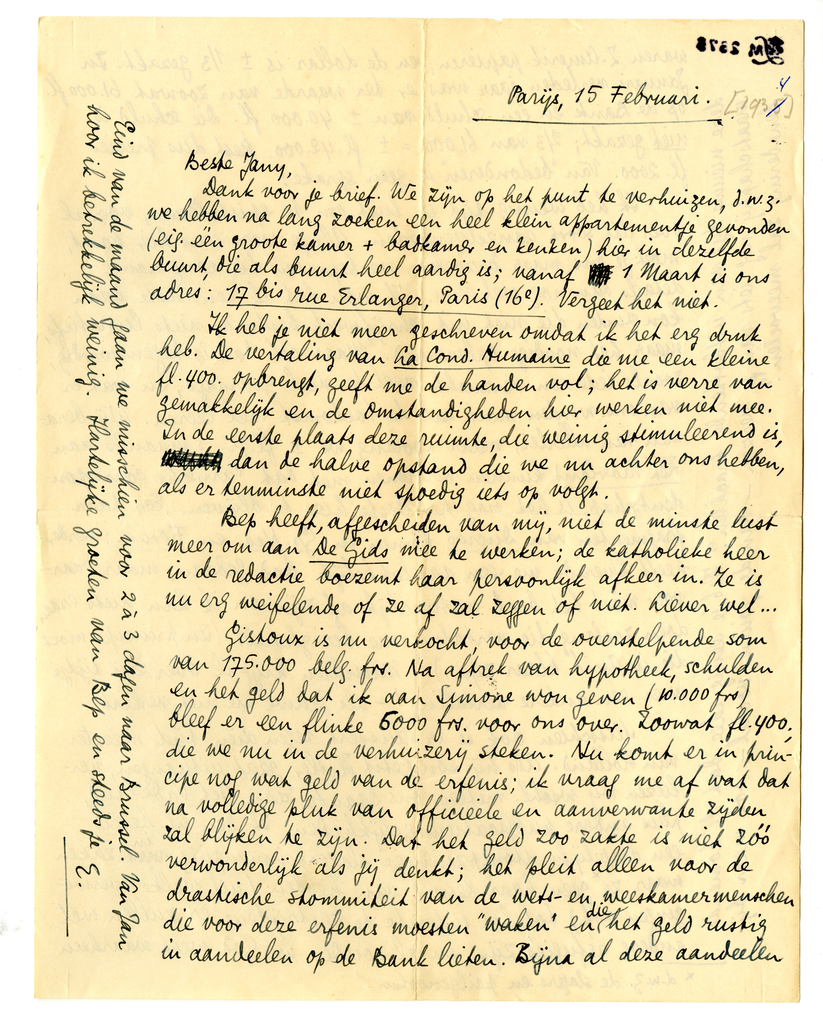 Dank voor je brief. We zijn op het punt te verhuizen, d.w.z. we hebben na lang zoeken een heel klein appartementje gevonden (eig. één groote kamer + badkamer en keuken) hier in dezelfde buurt, die als buurt heel aardig is; vanaf 1 Maart is ons adres: 17 bis rue Erlanger, Paris (16e). Vergeet het niet.