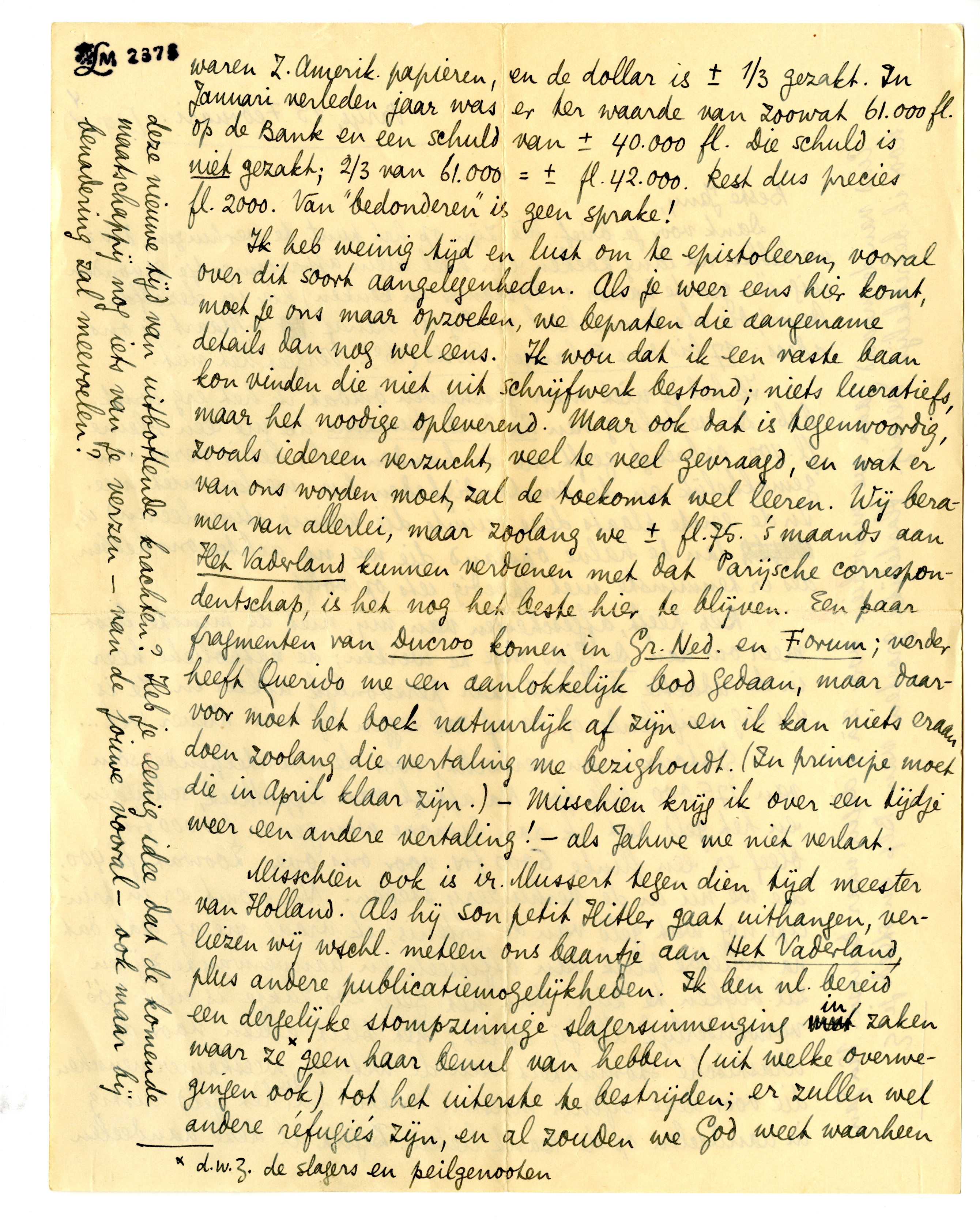 Ik heb weinig tijd en lust om te epistoleeren, vooral over dit soort aangelegenheden. Als je weer eens hier komt, moet je ons maar opzoeken, we bepraten die aangename details dan nog wel eens. Ik wou dat ik een vaste baan kon vinden die niet uit schrijfwerk bestond; niets lucratiefs, maar het noodige opleverend. Maar ook dat is tegenwoordig, zooals iedereen verzucht, veel te veel gevraagd, en wat er van ons worden moet, zal de toekomst wel leeren. Wij beramen van allerlei, maar zoolang we ± fl. 75. 's maands aan Het Vaderland kunnen verdienen met dat Parijsche correspondentschap, is het nog het beste hier te blijven. Een paar fragmenten van Ducroo komen in Gr. Ned. en Forum; verder heeft Querido me een aanlokkelijk bod gedaan, maar daarvoor moet het boek natuurlijk af zijn en ik kan niets eraan doen zoolang die vertaling me bezighoudt. (In principe moet die in April klaar zijn.) - Misschien krijg ik over een tijdje weer een andere vertaling! - als Jahwe me niet verlaat.