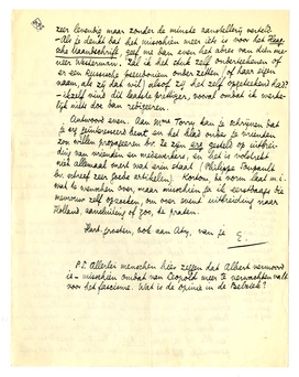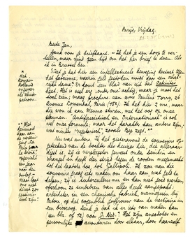 Weet je dat hier een intellectueele beweging bestaat tegen het fascisme, waarin geld gestoken wordt door een schatrijke dame.* Er komt een blad van uit dat Activités heet. Het is wel erg ‘onder ons’-achtig, maar je moet het toch zien; vraag proef nrs. aan Mme Pauline Torry, 26 Avenue Lowendal, Paris (15e). Ik heb hier 2 nrs., maar die wou ik aan Menno sturen, met het oog op onze plannen. ‘Antifascistisch en Internationaal’ is ook wel onze formule; maar het karakter kan anders zijn; wat minder ‘vegetarisch’, zooals Bep zegt.3090