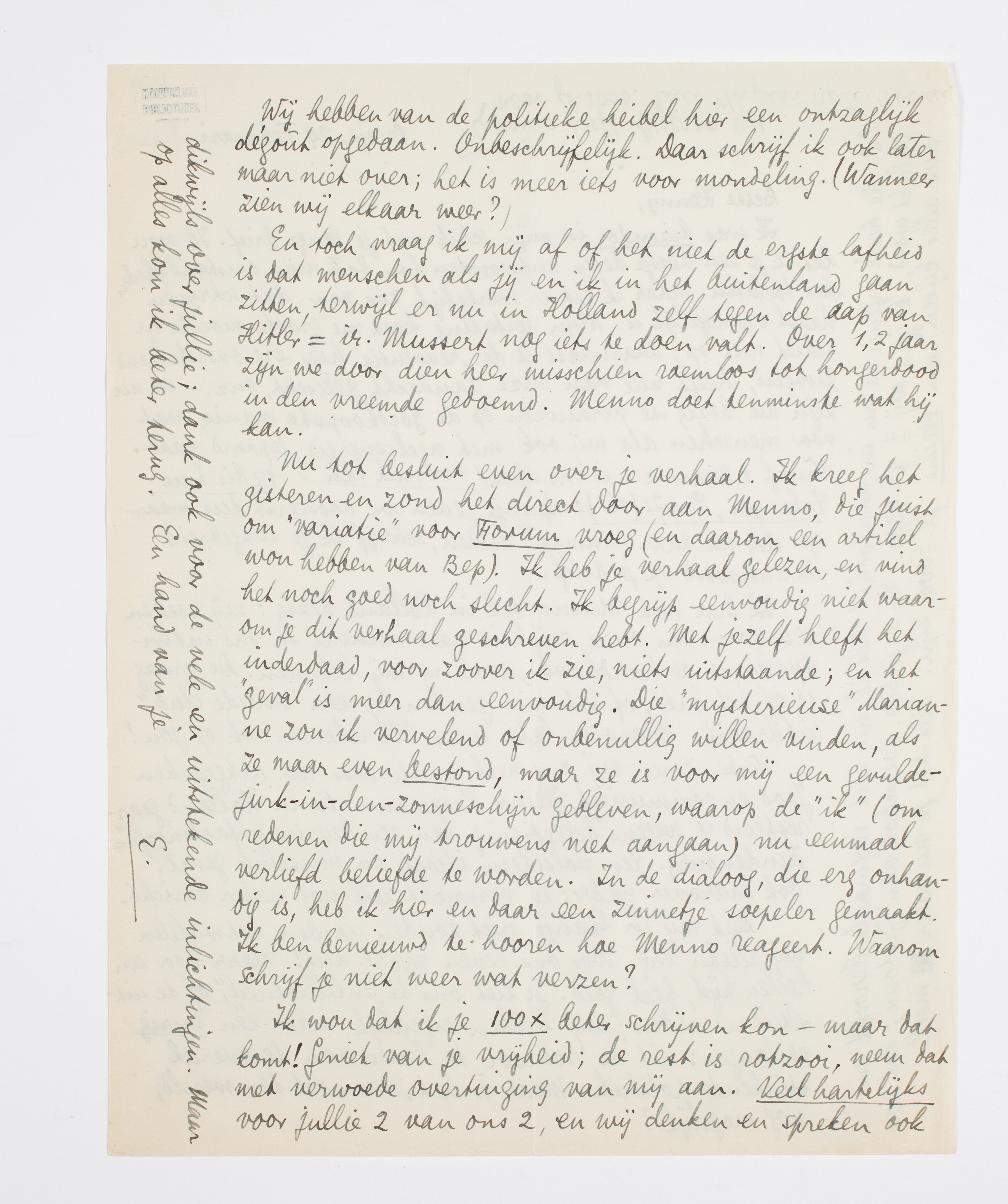 Nu tot besluit even overje verhaal.3093 Ik kreeg het gisteren en zond het direct door aan Menno, die juist om ‘variatie’ voor Forum vroeg (en daarom een artikel wou hebben van Bep). Ik heb je verhaal gelezen, en vind het noch goed noch slecht. Ik begrijp eenvoudig niet waarom je dit verhaal geschreven hebt. Met jezelf heeft het inderdaad, voor zoover ik zie, niets uitstaande; en het ‘geval’ is meer dan eenvoudig. Die ‘mysterieuse’ Marianne zou ik vervelend of onbenullig willen vinden, als ze maar even bestond, maar ze is voor mij een gevulde-jurk-in-den-zonneschijn gebleven, waarop de ‘ik’ (om redenen die mij trouwens niet aangaan) nu eenmaal verliefd beliefde te worden. In de dialoog, die erg onhandig is, heb ik hier en daar een zinnetje soepeler gemaakt. Ik ben benieuwd te hooren hoe Menno reageert. Waarom schrijf je niet weer wat verzen?